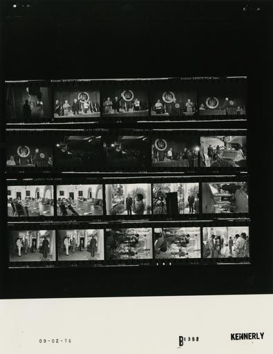 | Keywords: Ford B1352 NLGRF photo contact sheet (1976-09-01)(Gerald Ford Library).jpg White House Photographic Office WHPO is housed at the Gerald R Ford Presidential Library a branch of the National Archives and Records Administration NARA <br/><br/> This file is a 200 dpi photo contact sheet having images from roll of film B1352 of the August 9 1974 - January 20 1977 Gerald R Ford White House Photographic Office Series A0001-A9999 and B0001-B2886 photographs <br/><br/> The date on the photo contact sheet is the date the roll of film was processed not necessarily the date the photographs were taken See table below for additional details 1976-09-01 Gerald R Ford Presidential Library Image http //www fordlibrarymuseum gov/library/whphotos/B1352_NLGRF jpg B1352_NLGRF jpg from http //www fordlibrarymuseum gov/library/whphotos/19760901whpo pdf White House Photographs September 1 1976 of the http //www fordlibrarymuseum gov/Library/whphotos/whpo asp White House Photographic Collection page White House Photographic Office WHPO <br/> Creator David Hume Kennerly PD-USGov Institution Institution Gerald R Ford Presidential Library Table wikitable sortable + Photo contact sheet B1352 U S President Ford Administration Gerald R Ford Library Frame s Tone Subject proper Subject generic Names Geographic Location Photographer Date - 3 BW 98th General Conference of the National Guard Associations of the United States walking onto stage from behind curtain GRF Washington DC Washington Hilton Hotel -International Ballroom Kennerly 1976-09-01 - 4-5 BW 98th General Conference of the National Guard Associations of the United States GRF at lectern waving; others applauding; all not in frames GRF Maj Gens McMillan Bryant Warfield Miller Corning Weber Johnston; Brig Gens Higgins Walker; Lynn Washington DC Washington Hilton Hotel -International Ballroom Kennerly 1976-09-01 - 6-11 BW 98th General Conference of the National Guard Associations of the United States GRF at lectern speaking; others seated listening; various angles and distances; all not in frames GRF Maj Gens McMillan Bryant Warfield Miller Corning Weber Johnston; Brig Gens Higgins Walker; Lynn; Crowd Washington DC Washington Hilton Hotel -International Ballroom Kennerly 1976-09-01 - 12 BW Following 98th General Conference of the National Guard Associations of the United States GRF waving entering limousine; crowd in background GRF Secret Service Crowd Washington DC Washington Hilton Hotel - Outside Kennerly 1976-09-01 - 13-14 BW Meeting with Members of the Joint Committee on Atomic Energy seated around table GRF Sens Pastore Baker; Reps Price Anderson; Scowcroft Marsh Cabinet Room Kennerly 1976-09-01 - 15-22 BW Taping of Labor Day Message to the Nation GRF standing before video camera; various angles and distances; all not in every frame GRF Don Penny Technicians Others Patio outside Oval Office Kennerly 1976-09-01 Gerald R Ford Presidential Library and Museum-cooperation PD-USGov Contact sheets by the Ford White House September 1976 Photographs by David Hume Kennerly from 1976 |