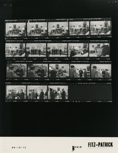 | Keywords: Ford B1515 NLGRF photo contact sheet (1976-09-16)(Gerald Ford Library).jpg White House Photographic Office WHPO is housed at the Gerald R Ford Presidential Library a branch of the National Archives and Records Administration NARA <br/><br/> This file is a 200 dpi photo contact sheet having images from roll of film B1515 of the August 9 1974 - January 20 1977 Gerald R Ford White House Photographic Office Series A0001-A9999 and B0001-B2886 photographs <br/><br/> The date on the photo contact sheet is the date the roll of film was processed not necessarily the date the photographs were taken See table below for additional details 1976-09-16 Gerald R Ford Presidential Library Image http //www fordlibrarymuseum gov/library/whphotos/B1515_NLGRF jpg B1515_NLGRF jpg from http //www fordlibrarymuseum gov/library/whphotos/19760916whpo pdf White House Photographs September 16 1976 of the http //www fordlibrarymuseum gov/Library/whphotos/whpo asp White House Photographic Collection page White House Photographic Office WHPO - Fitz-Patrick PD-USGov Institution Institution Gerald R Ford Presidential Library Table wikitable sortable + Photo contact sheet B1515 U S President Ford Administration Gerald R Ford Library Frame s Tone Subject proper Subject generic Names Geographic Location Photographer Date - 3-8 BW Meeting with Executive Secretary of National Religious Broadcasters; President of National Association of Evangelicals; and Associate Editor of Christianity Today and Producer of World Religious News seated near fireplace; various angles; Brannon and Roberts not in all frames GRF; Ben Armstrong Nathan Bailey Arthur Matthews Kathleen Osbeck; Bill Roberts or Bill Brannon Oval Office Fitz-Patrick 1976-09-16 - 9-10 BW Following Meeting with Executive Secretary of National Religious Broadcasters; President of National Association of Evangelicals; and Associate Editor of Christianity Today and Producer of World Religious News standing posing GRF; Ben Armstrong Nathan Bailey Arthur Matthews Kathleen Osbeck Oval Office Fitz-Patrick 1976-09-16 - 11-12 BW Interview with Representatives of Parade Magazine GRF and Walters seated near fireplace; Rothstein in foreground back to camera in 2nd frame taking photos GRF Bob Walters Arthur Rothstein Oval Office Fitz-Patrick 1976-09-16 - 13-14 BW Interview with Representatives of Parade Magazine seated talking near fireplace; Walters in foreground back to camera GRF Bob Walters Oval Office Fitz-Patrick 1976-09-16 - 15 BW Interview with Representatives of Parade Magazine GRF and Walters seated near fireplace; Rothstein in foreground back to camera taking photos GRF Bob Walters Arthur Rothstein Oval Office Fitz-Patrick 1976-09-16 - 16-20 BW Following an Interview with Representatives of Parade Magazine standing talking handshaking saying goodbye; all not in every frame; Nessen in last frame GRF Bob Walters Cody Shearer Arthur Rothstein Oval Office Fitz-Patrick 1976-09-16 Gerald R Ford Presidential Library and Museum-cooperation PD-USGov Contact sheets by the Ford White House September 1976 |