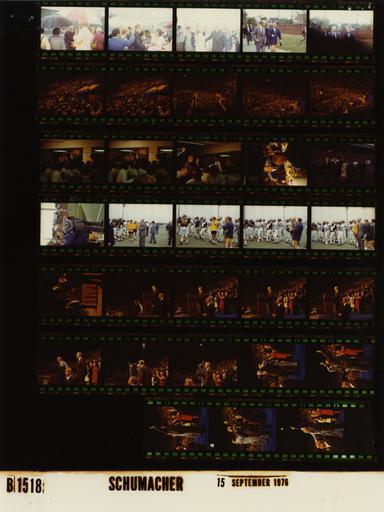 | Keywords: Ford B1518 NLGRF photo contact sheet (1976-09-15)(Gerald Ford Library).jpg White House Photographic Office WHPO is housed at the Gerald R Ford Presidential Library a branch of the National Archives and Records Administration NARA <br/><br/> This file is a 200 dpi photo contact sheet having images from roll of film B1518 of the August 9 1974 - January 20 1977 Gerald R Ford White House Photographic Office Series A0001-A9999 and B0001-B2886 photographs <br/><br/> The date on the photo contact sheet is the date the roll of film was processed not necessarily the date the photographs were taken See table below for additional details 1976-09-15 Gerald R Ford Presidential Library Image http //www fordlibrarymuseum gov/library/whphotos/B1518_NLGRF jpg B1518_NLGRF jpg from http //www fordlibrarymuseum gov/library/whphotos/19760915whpo pdf White House Photographs September 15 1976 of the http //www fordlibrarymuseum gov/Library/whphotos/whpo asp White House Photographic Collection page White House Photographic Office WHPO - Schumacher PD-USGov Institution Institution Gerald R Ford Presidential Library Table wikitable sortable + Photo contact sheet B1518 U S President Ford Administration Gerald R Ford Library Frame s Tone Subject proper Subject generic Names Geographic Location Photographer Date - 5-7 Color Trip to Michigan; Arrival at Willow Run Airport Prior to Motorcade to Ann Arbor - Ypsilanti Michigan greeting handshaking talking; GRF and BF under umbrellas; various angles and distances; all not in frames GRF Betty Ford W McLaughlin P Fletcher R Reicker N Chase M M R Robb M M G Griffith F Slatzman C Dukes E Gabriel D Upton P Gadola N Smith J Axe D Edgecomb; C Purcell Ypsilanti MI Willow Run Airport Schumacher 1976-09-15 - 8-10 Color Trip to Michigan -Attending University of Michigan Football Practice - Head Coach walking talking; standing on field in last frame GRF Glenn Bo Schembechler Ann Arbor MI University of Michigan Football Practice Field Schumacher 1976-09-15 - 11-14 Color Trip to Michigan -Attending University of Michigan Football Practice - Head Coach GRF standing with players watching practice; Bo not in all frames; all players not in frames GRF Glenn Bo Schembechler Michigan Football Players Ann Arbor MI University of Michigan Football Practice Field Schumacher 1976-09-15 - 15-17 Color Trip to Michigan -Prior to Dinner with the University of Michigan Football Team GRF standing addressing team; others seated; all not in frames GRF Michigan Football Players Ann Arbor MI University of Michigan -Michigan Union Schumacher 1976-09-15 - 18 Color Trip to Michigan -Dinner with the University of Michigan Football Team seated at table eating; all not in frame GRF Michigan Football Players Ann Arbor MI University of Michigan -Michigan Union Schumacher 1976-09-15 - 19 Color Trip to Michigan -Prior to Campaign Kickoff Rally at the University of Michigan standing talking GRF Robben Mrs Fleming; Carl Purcell Ann Arbor MI University of Michigan -Crisler Arena -Outside Schumacher 1976-09-15 - 20-24 Color Trip to Michigan -Campaign Kickoff Rally at the University of Michigan GRF speaking at lectern; long shots taken from higher vantage point; various angles and distances; all not in every frame GRF Betty Ford Bob Ufer Robben Fleming Sen Griffin Platform guests Others; Crowd Ann Arbor MI University of Michigan -Crisler Arena Schumacher 1976-09-15 - 25-29 Color Trip to Michigan - Campaign Kickoff Rally at the University of Michigan GRF at lectern speaking; others in background; standing applauding in some frames; all not in every frame; taken from left of GRF GRF Betty Ford Bob Ufer Robben Fleming Sen Griffin Platform guests Others Ann Arbor MI University of Michigan -Crisler Arena Schumacher 1976-09-15 - 30-37 Color Trip to Michigan -Campaign Kickoff Rally at the University of Michigan Ufer presenting Michigan 1 windbreaker to GRF; GRF wearing jacket waving to crowd; back to camera in some frames; taken from left of GRF; all not in every frame GRF Betty Ford Bob Ufer Robben Fleming Sen Griffin Platform guests Others Ann Arbor MI University of Michigan -Crisler Arena Schumacher 1976-09-15 Gerald R Ford Presidential Library and Museum-cooperation PD-USGov Contact sheets by the Ford White House September 1976 |