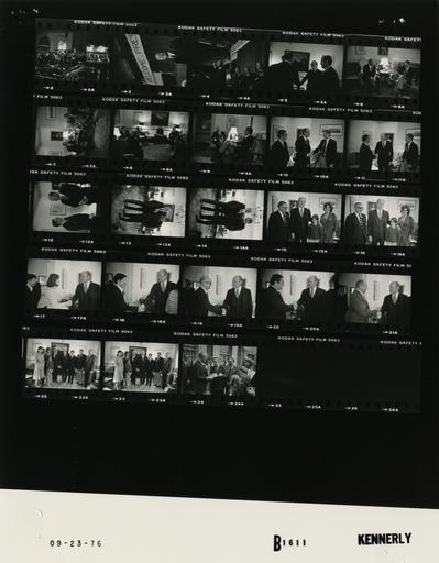 Keywords: Ford B1611 NLGRF photo contact sheet (1976-09-24)(Gerald Ford Library).jpg White House Photographic Office WHPO is housed at the Gerald R Ford Presidential Library a branch of the National Archives and Records Administration NARA <br/><br/> This file is a 200 dpi photo contact sheet having images from roll of film B1611 of the August 9 1974 - January 20 1977 Gerald R Ford White House Photographic Office Series A0001-A9999 and B0001-B2886 photographs <br/><br/> The date on the photo contact sheet is the date the roll of film was processed not necessarily the date the photographs were taken See table below for additional details 1976-09-24 Gerald R Ford Presidential Library Image http //www fordlibrarymuseum gov/library/whphotos/B1611_NLGRF jpg B1611_NLGRF jpg from http //www fordlibrarymuseum gov/library/whphotos/19760924whpo pdf White House Photographs September 24 1976 of the http //www fordlibrarymuseum gov/Library/whphotos/whpo asp White House Photographic Collection page White House Photographic Office WHPO <br/> Creator David Hume Kennerly PD-USGov Institution Institution Gerald R Ford Presidential Library Table wikitable sortable + Photo contact sheet B1611 U S President Ford Administration Gerald R Ford Library Frame s Tone Subject proper Subject generic Names Geographic Location Photographer Date - 2 BW Trip to Philadelphia Pennsylvania - Arrival for Post Debate Reception Sponsored by the President Ford Committees PFC of Pennsylvania Delaware and New Jersey Shortly after Midnight GRF stepping from limousine waving; crowd and hotel in background GRF Crowd Philadelphia PA Bellevue Stratford Hotel - Outside Kennerly 1976-09-24 - 3-4 BW Trip to Philadelphia Pennsylvania - Post Debate Reception Sponsored by the President Ford Committees PFC of Pennsylvania Delaware and New Jersey Shortly after Midnight GRF standing at lectern speaking confetti on shoulder; Welcome President Ford sign in background GRF Philadelphia PA Bellevue Stratford Hotel - Grand Ballroom Kennerly 1976-09-24 - 5-12 BW Trip to Philadelphia Pennsylvania - Meeting with Vice President of ABC News Special Programs and Senior Producer NBC News Special Programs greeting handshaking standing talking; seated around table in some frames; various angles and distances; all not in every frame GRF Cheney Raoul-Duval; Walter Phister Elliot Bernstein Philadelphia PA Barclay House - President's Suite Kennerly 1976-09-24 - 13-14 BW Trip to Philadelphia Pennsylvania standing talking; Baker holding small piece of paper schedule GRF James Baker Philadelphia PA Barclay House - President's Suite Kennerly 1976-09-24 - 15-16 BW Trip to Philadelphia Pennsylvania - Meeting with Republican Leaders from Bucks Chester Delaware and Montgomery Counties Pennsylvania standing posing GRF Unidentified Man Woman Girl Philadelphia PA Barclay House - President's Suite Kennerly 1976-09-24 - 17-23 BW Trip to Philadelphia Pennsylvania - Meeting with Republican Leaders from Bucks Chester Delaware and Montgomery Counties Pennsylvania greeting handshaking individually not all in frames ; posing in group in last two frames GRF Harry Fawkes Karen McIlhinney Theodore Rubino Tom Judge John McNichol Daniel Beren Richard Stoddard; Unidentified Girl Philadelphia PA Barclay House - President's Suite Kennerly 1976-09-24 - 24 BW Trip to Philadelphia Pennsylvania - Prior to departure for the Benjamin Franklin Hotel standing talking; man showing GRF an open book GRF Others Philadelphia PA Barclay House - Outside Kennerly 1976-09-24 Gerald R Ford Presidential Library and Museum-cooperation PD-USGov Contact sheets by the Ford White House September 1976 Photographs by David Hume Kennerly from 1976 |