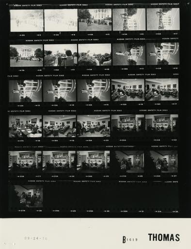 Keywords: Ford B1619 NLGRF photo contact sheet (1976-09-23)(Gerald Ford Library).jpg White House Photographic Office WHPO is housed at the Gerald R Ford Presidential Library a branch of the National Archives and Records Administration NARA <br/><br/> This file is a 200 dpi photo contact sheet having images from roll of film B1619 of the August 9 1974 - January 20 1977 Gerald R Ford White House Photographic Office Series A0001-A9999 and B0001-B2886 photographs <br/><br/> The date on the photo contact sheet is the date the roll of film was processed not necessarily the date the photographs were taken See table below for additional details 1976-09-23 Gerald R Ford Presidential Library Image http //www fordlibrarymuseum gov/library/whphotos/B1619_NLGRF jpg B1619_NLGRF jpg from http //www fordlibrarymuseum gov/library/whphotos/19760923whpo pdf White House Photographs September 23 1976 of the http //www fordlibrarymuseum gov/Library/whphotos/whpo asp White House Photographic Collection page White House Photographic Office WHPO - Thomas PD-USGov Institution Institution Gerald R Ford Presidential Library Table wikitable sortable + Photo contact sheet B1619 U S President Ford Administration Gerald R Ford Library Frame s Tone Subject proper Subject generic Names Geographic Location Photographer Date - 2A-7A BW Prior to Departure for Andrews Air Force Base and Trip to Philadelphia PA GRF and Bf walking past crowd; crowd and White House in background GRF Betty Ford White House staff South Lawn Thomas 1976-09-23 - 8A-9A BW Departure for Andrews Air Force Base and Trip to Philadelphia PA waving toward Marine One ascending in background ; taken from behind staff; backs of heads in foreground White House staff South Lawn Thomas 1976-09-23 - 10A-14A BW Writer standing posing; on lawn in 1st frame; on driveway in remainder; White House in background Tom Lee South Lawn/Driveway Thomas 1976-09-23 - 15A-19A BW Vickerman Group seated around table; various angles and distances Vickerman Unidentified Group Roosevelt Room Thomas 1976-09-24 - 20A-24A BW Meeting with Press Secretary to the President-Elect of the United Mexican States seated talking Nessen M Gujardo Others Nessen's Office Thomas 1976-09-24 - 25A-27A BW Press Briefing on Progress of Peace Negotiations in Southern Africa GRF on left behind lectern speaking; photographs kneeling in foreground; media on right GRF Media Press Briefing Room Thomas 1976-09-24 Gerald R Ford Presidential Library and Museum-cooperation PD-USGov Contact sheets by the Ford White House September 1976 |