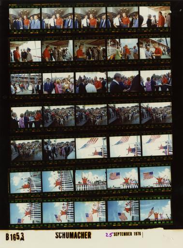 | Keywords: Ford B1653 NLGRF photo contact sheet (1976-09-25)(Gerald Ford Library).jpg White House Photographic Office WHPO is housed at the Gerald R Ford Presidential Library a branch of the National Archives and Records Administration NARA <br/><br/> This file is a 200 dpi photo contact sheet having images from roll of film B1653 of the August 9 1974 - January 20 1977 Gerald R Ford White House Photographic Office Series A0001-A9999 and B0001-B2886 photographs <br/><br/> The date on the photo contact sheet is the date the roll of film was processed not necessarily the date the photographs were taken See table below for additional details 1976-09-25 Gerald R Ford Presidential Library Image http //www fordlibrarymuseum gov/library/whphotos/B1653_NLGRF jpg B1653_NLGRF jpg from http //www fordlibrarymuseum gov/library/whphotos/19760925whpo pdf White House Photographs September 25 1976 of the http //www fordlibrarymuseum gov/Library/whphotos/whpo asp White House Photographic Collection page White House Photographic Office WHPO - Schumacher PD-USGov Institution Institution Gerald R Ford Presidential Library Table wikitable sortable + Photo contact sheet B1653 U S President Ford Administration Gerald R Ford Library Frame s Tone Subject proper Subject generic Names Geographic Location Photographer Date - 3-6 Color Campaign Trip to Louisiana - Cruise Aboard SS Natchez Paddleboat - Meeting Southern Leaders standing talking; GRF in red golf shirt; all not in frames GRF Southern Leaders from Georgia Mississippi River; LA SS Natchez Schumacher 1976-09-25 - 7-11 Color Campaign Trip to Louisiana - Cruise Aboard SS Natchez Paddleboat standing talking on deck; GRF in red golf shirt; various angles and distances; all not in every frame GRF Others Mississippi River; LA SS Natchez Schumacher 1976-09-25 - 12 Color Campaign Trip to Louisiana - Cruise Aboard SS Natchez Paddleboat talking; GRF with hand on man's shoulder; wearing red golf shirt GRF Unidentified Man Destrehan LA Destrehan Ferry Landing Schumacher 1976-09-25 - 13 Color Campaign Trip to Louisiana - Cruise Aboard SS Natchez Paddleboat GRF and BF walking down gangplank waving; GRF in red golf shirt; women wearing 19th Century gowns; all not in frame GRF Betty Ford Unidentified women Crowd Destrehan LA Destrehan Ferry Landing Schumacher 1976-09-25 - 14-24 Color Campaign Trip to Louisiana - Cruise Aboard SS Natchez Paddleboat greeting handshaking; leaning over railing to shake hands in some frames; GRF in red golf shirt; various angles and distances; all not in every frame GRF Betty Ford Crowd Destrehan LA Destrehan Ferry Landing Schumacher 1976-09-25 - 25-37 Color Campaign Trip to Louisiana - Cruise Aboard SS Natchez Paddleboat standing waving under billowing flag; GRF wearking red golf shirt; taken from lower level; BF not in every frame GRF Betty Ford Mississippi River SS Natchez Schumacher 1976-09-25 Gerald R Ford Presidential Library and Museum-cooperation PD-USGov Contact sheets by the Ford White House September 1976 |