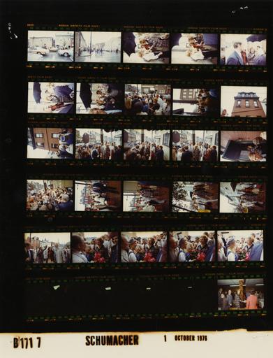 | Keywords: Ford B1717 NLGRF photo contact sheet (1976-10-01)(Gerald Ford Library).jpg White House Photographic Office WHPO is housed at the Gerald R Ford Presidential Library a branch of the National Archives and Records Administration NARA <br/><br/> This file is a 200 dpi photo contact sheet having images from roll of film B1717 of the August 9 1974 - January 20 1977 Gerald R Ford White House Photographic Office Series A0001-A9999 and B0001-B2886 photographs <br/><br/> The date on the photo contact sheet is the date the roll of film was processed not necessarily the date the photographs were taken See table below for additional details 1976-10-01 Gerald R Ford Presidential Library Image http //www fordlibrarymuseum gov/library/whphotos/B1717_NLGRF jpg B1717_NLGRF jpg from http //www fordlibrarymuseum gov/library/whphotos/19761001whpo pdf White House Photographs October 1 1976 of the http //www fordlibrarymuseum gov/Library/whphotos/whpo asp White House Photographic Collection page White House Photographic Office WHPO - Schumacher PD-USGov Institution Institution Gerald R Ford Presidential Library Table wikitable sortable + Photo contact sheet B1717 U S President Ford Administration Gerald R Ford Library Frame s Tone Subject proper Subject generic Names Geographic Location Photographer Date - 2-3 Color Betty Ford Campaign Trip to Pennsylvania - Arrival in Pittsburgh Neighborhppd for Registration Drive standing in rain Crowd Pittsburgh PA Street -Southside Schumacher 1976-10-01 - 4-22 Color Betty Ford Campaign Trip to Pennsylvania - Walking in Pittsburgh Neighborhood during Registration Drive BF walking along sidewalk in rain; greeting handshaking standing takling; various angles and distances; all not in every frame Betty Ford Crowd Secret Service Pittsburgh PA Street -Southside Schumacher 1976-10-01 - 23-26 Color Betty Ford Campaign Trip to Pennsylvania - Visit to Lithuanian Citizens Society of Western Pennsylvania Hall BF talking to women in traditional Lithuanian clothing; all not in every frame Betty Ford Crowd Secret Service Pittsburgh PA Lithuanian Citizens Society Hall - Outside Schumacher 1976-10-01 - 27-30 Color Pittsburgh PA Schumacher 1976-10-01 - 31 Color Betty Ford Campaign Trip to Pennsylvania - Prior to Departure for Indianapolis Indiana greeting handshaking talking Betty Ford Others Pittsburgh PA Allegheny County Airport Schumacher 1976-10-01 Gerald R Ford Presidential Library and Museum-cooperation PD-USGov Contact sheets by the Ford White House October 1976 |
