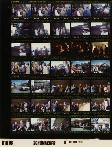 | Keywords: Ford B1806 NLGRF photo contact sheet (1976-10-10)(Gerald Ford Library).jpg White House Photographic Office WHPO is housed at the Gerald R Ford Presidential Library a branch of the National Archives and Records Administration NARA <br/><br/> This file is a 200 dpi photo contact sheet having images from roll of film B1806 of the August 9 1974 - January 20 1977 Gerald R Ford White House Photographic Office Series A0001-A9999 and B0001-B2886 photographs <br/><br/> The date on the photo contact sheet is the date the roll of film was processed not necessarily the date the photographs were taken See table below for additional details 1976-10-10 Gerald R Ford Presidential Library Image http //www fordlibrarymuseum gov/library/whphotos/B1806_NLGRF jpg B1806_NLGRF jpg from http //www fordlibrarymuseum gov/library/whphotos/19761010whpo pdf White House Photographs October 10 1976 of the http //www fordlibrarymuseum gov/Library/whphotos/whpo asp White House Photographic Collection page White House Photographic Office WHPO - Schumacher PD-USGov Institution Institution Gerald R Ford Presidential Library Table wikitable sortable + Photo contact sheet B1806 U S President Ford Administration Gerald R Ford Library Frame s Tone Subject proper Subject generic Names Geographic Location Photographer Date - 1A-11A Color Betty Ford Campaign Trip To Buffalo New York - Following Sunday Services standing talking posing waving on front steps of church Bishop holding staff; various angles and distances; all not in every frame Betty Ford Bishop Harold Robinson Others Buffalo NY St Paul's Episcopal Cathedral - Outside Schumacher 1976-10-10 - 12A Color Betty Ford Campaign Trip To Buffalo New York standing near limousine Betty Ford Two Unidentified Men Buffalo NY Street Schumacher 1976-10-10 - 13A-14A Color Betty Ford Campaign Trip To Buffalo New York standing talking; close up taken over BF's shoulder Betty Ford Unidentified Woman Buffalo NY Unidentified Location Schumacher 1976-10-10 - 15A Color Betty Ford Campaign Trip To Buffalo New York standing backlit Betty Ford Richard Rosenbaum Unidentified Man Buffalo NY Unidentified Room Schumacher 1976-10-10 - 16A-17A Color Betty Ford Campaign Trip To Buffalo New York - Prior to Pulaski Day Parade greeting handshaking Betty Ford Unidentified Men Crowd Buffalo NY Street Schumacher 1976-10-10 - 18A-22A Color Betty Ford Campaign Trip To Buffalo New York - Pulaski Day Parade BF seated in back of open convertible waving; Agents walking on wither side; crowd along curbs; various angles and distances Betty Ford Secret Service Parade Participants Crowd Buffalo NY Broadway Avenue Schumacher 1976-10-10 - 23A-34A Color Betty Ford Campaign Trip To Buffalo New York - Remarks Following Pulaski Day Parade BF at microphone speaking; various angles and distances; all not in every frame Betty Ford Secret Service Parade Participants Others Buffalo NY Podium -Outside Schumacher 1976-10-10 - 35A Color Betty Ford Campaign Trip To Buffalo New York - Remarks Following Pulaski Day Parade BF in background; acrobats in foreground backs to camera Betty Ford Acrobats Buffalo NY Podium -Outside Schumacher 1976-10-10 Gerald R Ford Presidential Library and Museum-cooperation PD-USGov Contact sheets by the Ford White House October 1976 |
