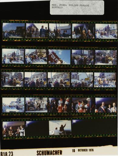 | Keywords: Ford B1823 NLGRF photo contact sheet (1976-10-10)(Gerald Ford Library).jpg White House Photographic Office WHPO is housed at the Gerald R Ford Presidential Library a branch of the National Archives and Records Administration NARA <br/><br/> This file is a 200 dpi photo contact sheet having images from roll of film B1823 of the August 9 1974 - January 20 1977 Gerald R Ford White House Photographic Office Series A0001-A9999 and B0001-B2886 photographs <br/><br/> The date on the photo contact sheet is the date the roll of film was processed not necessarily the date the photographs were taken See table below for additional details 1976-10-10 Gerald R Ford Presidential Library Image http //www fordlibrarymuseum gov/library/whphotos/B1823_NLGRF jpg B1823_NLGRF jpg from http //www fordlibrarymuseum gov/library/whphotos/19761010whpo pdf White House Photographs October 10 1976 of the http //www fordlibrarymuseum gov/Library/whphotos/whpo asp White House Photographic Collection page White House Photographic Office WHPO - Schumacher PD-USGov Institution Institution Gerald R Ford Presidential Library Table wikitable sortable + Photo contact sheet B1823 U S President Ford Administration Gerald R Ford Library Frame s Tone Subject proper Subject generic Names Geographic Location Photographer Date - 2A Color Betty Ford Campaign Trip To Buffalo New York - Pulaski Day Parade BF seated in back of open convertible waving; Agents walking on wither side; crowd along curbs; various angles and distances Betty Ford Secret Service Parade Participants Crowd Buffalo NY Broadway Avenue Schumacher 1976-10-10 - 3A Color Betty Ford Campaign Trip To Buffalo New York - Pulaski Day Parade standing along curb watching parade not seen Weidenfeld Others Buffalo NY Broadway Avenue Schumacher 1976-10-10 - 4A-17A Color Betty Ford Campaign Trip To Buffalo New York - Pulaski Day Parade BF seated in back of open convertible waving; Agents walking on wither side; crowd along curbs; various angles and distances Betty Ford Secret Service Parade Participants Crowd Buffalo NY Broadway Avenue Schumacher 1976-10-10 - 18A Color Betty Ford Campaign Trip To Buffalo New York - Pulaski Day Parade standing along curb talking possibly arguing; officer seated on motorcycle Weidenfeld Motorcycle Police Officer Others Crowd Buffalo NY Broadway Avenue Schumacher 1976-10-10 - 19A-20A Color Betty Ford Campaign Trip To Buffalo New York - Pulaski Day Parade on stage; BF bending talking tow girls in drum-major type uniforms; others in background Betty Ford Parade Participants Two Girls Buffalo NY Broadway Avenue Schumacher 1976-10-10 - 21A Color Betty Ford Campaign Trip To Buffalo New York - Pulaski Day Parade - Democratic Candidate for Vice President on stage; Mondale wearing red sash Walter Mondale Others Buffalo NY Broadway Avenue Schumacher 1976-10-10 - 22A Color Betty Ford Campaign Trip To Buffalo New York - Pulaski Day Parade BF on stage waving; others applauding Betty Ford Others Buffalo NY Broadway Avenue Schumacher 1976-10-10 - 23A Color Schumacher 1976-10-10 - 24A Color Betty Ford Campaign Trip To Buffalo New York - Following Pulaski Day Parade standing in door of limousine waving; back to camera; taken from higher vantage point Betty Ford Buffalo NY Broadway Avenue Schumacher 1976-10-10 Gerald R Ford Presidential Library and Museum-cooperation PD-USGov Contact sheets by the Ford White House October 1976 |