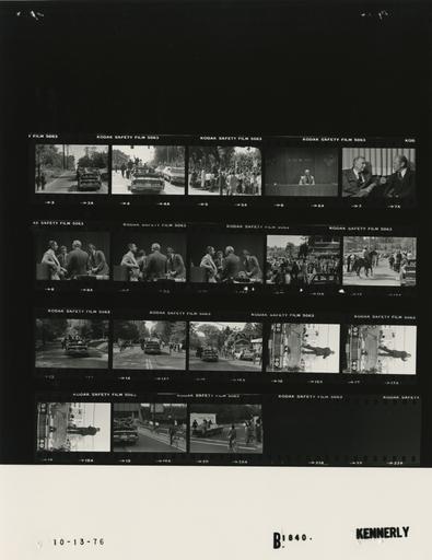 | Keywords: Ford B1840 NLGRF photo contact sheet (1976-10-13)(Gerald Ford Library).jpg White House Photographic Office WHPO is housed at the Gerald R Ford Presidential Library a branch of the National Archives and Records Administration NARA <br/><br/> This file is a 200 dpi photo contact sheet having images from roll of film B1840 of the August 9 1974 - January 20 1977 Gerald R Ford White House Photographic Office Series A0001-A9999 and B0001-B2886 photographs <br/><br/> The date on the photo contact sheet is the date the roll of film was processed not necessarily the date the photographs were taken See table below for additional details 1976-10-13 Gerald R Ford Presidential Library Image http //www fordlibrarymuseum gov/library/whphotos/B1840_NLGRF jpg B1840_NLGRF jpg from http //www fordlibrarymuseum gov/library/whphotos/19761013whpo pdf White House Photographs October 13 1976 of the http //www fordlibrarymuseum gov/Library/whphotos/whpo asp White House Photographic Collection page White House Photographic Office WHPO <br/> Creator David Hume Kennerly PD-USGov Institution Institution Gerald R Ford Presidential Library Table wikitable sortable + Photo contact sheet B1840 U S President Ford Administration Gerald R Ford Library Frame s Tone Subject proper Subject generic Names Geographic Location Photographer Date - 3-4 BW Campaign Trip to New York; Motorcade to Campaign Rally in Yonkers - Yonkers New York GRF waving riding in lead vehicle; Secret Riding in 2nd limousine; rolling away from camera; close up; Yonkers City Hall in background GRF Secret Service Yonkers NY Street Kennerly 1976-10-13 - 5 BW Campaign Trip to New York; Arrival for Campaign Rally in Yonkers - Yonkers New York GRF walking from limousine toward City Hall not seen ; long shot GRF Crowd Others Yonkers NY Yonkers City Hall - Outside Kennerly 1976-10-13 - 6 BW Campaign Trip to New York seated behind bench; In God We Trust sign in background Keiser New York NY Courtroom - Rockland County Courthouse Kennerly 1976-10-13 - 7 BW Campaign Trip to New York - Interview with CBS News Correspondent seated talking; close up GRF Walter Cronkite New York NY Rockland County Courthouse -Holding Room Kennerly 1976-10-13 - 8010 BW Campaign Trip to New York - Following Interview with CBS News Correspondent standing talking; Cronkite's back to camera Nessen Don Penny Schneider Walter Cronkite Unidentified Man New York NY Rockland County Courthouse -Holding Room Kennerly 1976-10-13 - 11-15 BW Campaign Trip to New York; Motorcade to Campaign Rally in White Plains - White Plains New York riding in limousine; rolling away from camera; mounted police in 2nd frame Secret Service Police Crowd White Plains NY Street Kennerly 1976-10-13 - 16-18 BW Campaign Trip to New Jersey; Campaign Rally in Union - Union New Jersey standing on roof of limousine; holding microphone speaking GRF Union NJ Town and Campus Inn - Outside Kennerly 1976-10-13 - 19-20 BW Campaign Trip to New Jersey; Motorcade to Newark International Airport; US Representative from New Jersey NJ - Union New Jersey Secret Service riding in limousine; gesturing toward boy to stay back from vehicle; rolling away from camera; making right turn in 2nd frame Secret Service Boy on Bicycle Union NJ Street Kennerly 1976-10-13 Gerald R Ford Presidential Library and Museum-cooperation PD-USGov Contact sheets by the Ford White House October 1976 Photographs by David Hume Kennerly from 1976 Walter Cronkite |