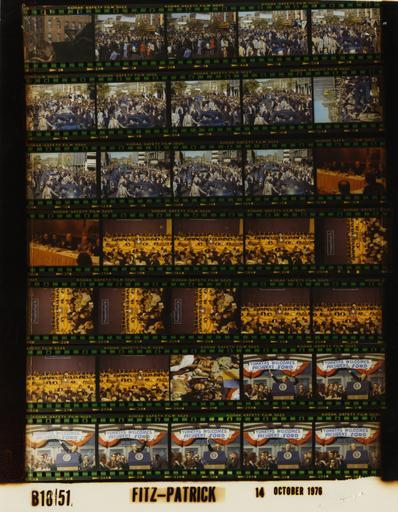 | Keywords: Ford B1851 NLGRF photo contact sheet (1976-10-12)(Gerald Ford Library).jpg White House Photographic Office WHPO is housed at the Gerald R Ford Presidential Library a branch of the National Archives and Records Administration NARA <br/><br/> This file is a 200 dpi photo contact sheet having images from roll of film B1851 of the August 9 1974 - January 20 1977 Gerald R Ford White House Photographic Office Series A0001-A9999 and B0001-B2886 photographs <br/><br/> The date on the photo contact sheet is the date the roll of film was processed not necessarily the date the photographs were taken See table below for additional details 1976-10-12 Gerald R Ford Presidential Library Image http //www fordlibrarymuseum gov/library/whphotos/B1851_NLGRF jpg B1851_NLGRF jpg from http //www fordlibrarymuseum gov/library/whphotos/19761012whpo pdf White House Photographs October 12 1976 of the http //www fordlibrarymuseum gov/Library/whphotos/whpo asp White House Photographic Collection page White House Photographic Office WHPO - Fitz-Patrick PD-USGov Institution Institution Gerald R Ford Presidential Library Table wikitable sortable + Photo contact sheet B1851 U S President Ford Administration Gerald R Ford Library Frame s Tone Subject proper Subject generic Names Geographic Location Photographer Date - 2 Color Campaign Trip to New York - Motorcade through Brooklyn Borough Park Bay Ridge Brooklyn NY Apartment Building Fitz-Patrick 1976-10-12 - 3-15 Color Campaign Trip to New York - Motorcade through Brooklyn Borough Park Bay Ridge GRF and Buckley standing through roof of limousine waving; GRF using microphone; agents walking alongside; crowd in background; moving toward camera GRF Sens Buckley Javits Secret Service Crowd Brooklyn NY Street Fitz-Patrick 1976-10-12 - 16-17 Color Campaign Trip to New York - Meeting with New York Media Executives seated around table; all not in frames GRF W Kerby W Phillips L Tanzer R Davidson J McManus P Derow E Kosner W Attwood D Laventhol J Oakes S Topping D Schiff J Wechsler W James M O;Neill J Hughes E Foell L Goldenson Others Cheney Nessen Juddah Sommer New York NY New York Hilton Hotel - Beckman Room Fitz-Patrick 1976-10-12 - 18-24 Color Campaign Trip to New York - New York Salute to the President Dinner GRF at lectern speaking; all not in frames; long shots from back of room; formal wear GRF Rockefeller Rosenbaum Platform Guests Others New York NY New York Hilton Hotel - Mercury Ballroom Fitz-Patrick 1976-10-12 - 25-28 Color Campaign Trip to New York - New York Salute to the President Dinner Woman at lectern speaking; others seated listening; all not in frames; formal wear GRF Unidentified Woman Rockefeller Rosenbaum Platform Guests Others New York NY New York Hilton Hotel - Mercury Ballroom Fitz-Patrick 1976-10-12 - 29 Color Campaign Trip to New York; Campaign Rally in Yonkers - Yonkers New York close up cheering Crowd Yonkers NY Yonkers City Hall - Outside Fitz-Patrick 1976-10-13 - 30-36 Color Campaign Trip to New York; Campaign Rally in Yonkers - Yonkers New York GRF standing behind lectern; speaking waving smiling; others in background; Yonkers Welcomes President Ford sign in background GRF Rep Wydler Others Yonkers NY Yonkers City Hall - Outside Fitz-Patrick 1976-10-13 Gerald R Ford Presidential Library and Museum-cooperation PD-USGov Contact sheets by the Ford White House October 1976 |