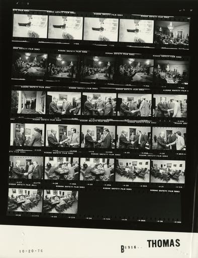 | Keywords: Ford B1916 NLGRF photo contact sheet (1976-10-20)(Gerald Ford Library).jpg White House Photographic Office WHPO is housed at the Gerald R Ford Presidential Library a branch of the National Archives and Records Administration NARA <br/><br/> This file is a 200 dpi photo contact sheet having images from roll of film B1916 of the August 9 1974 - January 20 1977 Gerald R Ford White House Photographic Office Series A0001-A9999 and B0001-B2886 photographs <br/><br/> The date on the photo contact sheet is the date the roll of film was processed not necessarily the date the photographs were taken See table below for additional details 1976-10-20 Gerald R Ford Presidential Library Image http //www fordlibrarymuseum gov/library/whphotos/B1916_NLGRF jpg B1916_NLGRF jpg from http //www fordlibrarymuseum gov/library/whphotos/19761020whpo pdf White House Photographs October 20 1976 of the http //www fordlibrarymuseum gov/Library/whphotos/whpo asp White House Photographic Collection page White House Photographic Office WHPO - Thomas PD-USGov Institution Institution Gerald R Ford Presidential Library Table wikitable sortable + Photo contact sheet B1916 U S President Ford Administration Gerald R Ford Library Frame s Tone Subject proper Subject generic Names Geographic Location Photographer Date - 7-10 BW standing posing; White House in background Unidentified Woman South Driveway Thomas 1976-10-20 - 11-15 BW 39th Press Conference GRF at lectern speaking; others seated; long shots GRF Media East Room Thomas 1976-10-20 - 16 BW Following 39th Press Conference media standing surrounding GRF; long shot taken from higher vantage point GRF Media East Room Thomas 1976-10-20 - 17 BW Following 39th Press Conference standing talking; long shot; sillihouette GRF Cheney Others Colonnade Thomas 1976-10-20 - 18-27 BW Prior to Interview with Representatives of Panax Corporation greeting handshaking standing posing; all not in every frame GRF J McGoff H Buckle B Liepprandi J Schiappa R Berg C Brossier M Brunson D Hoenschell M Kehetian T Ochiltree F Shapard R Skuggen UPI Photographer; Nessen Roosevelt Room Thomas 1976-10-20 - 28-33 BW Interview with Representatives of Panax Corporation seated around table; various distances; taken from behind and right of GRF GRF J McGoff H Buckle B Liepprandi J Schiappa R Berg C Brossier M Brunson D Hoenschell M Kehetian T Ochiltree F Shapard R Skuggen UPI Photographer; Nessen Roosevelt Room Thomas 1976-10-20 Gerald R Ford Presidential Library and Museum-cooperation PD-USGov Contact sheets by the Ford White House October 1976 |