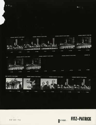 | Keywords: Ford B1932 NLGRF photo contact sheet (1976-10-21)(Gerald Ford Library).jpg White House Photographic Office WHPO is housed at the Gerald R Ford Presidential Library a branch of the National Archives and Records Administration NARA <br/><br/> This file is a 200 dpi photo contact sheet having images from roll of film B1932 of the August 9 1974 - January 20 1977 Gerald R Ford White House Photographic Office Series A0001-A9999 and B0001-B2886 photographs <br/><br/> The date on the photo contact sheet is the date the roll of film was processed not necessarily the date the photographs were taken See table below for additional details 1976-10-21 Gerald R Ford Presidential Library Image http //www fordlibrarymuseum gov/library/whphotos/B1932_NLGRF jpg B1932_NLGRF jpg from http //www fordlibrarymuseum gov/library/whphotos/19761021whpo pdf White House Photographs October 21 1976 of the http //www fordlibrarymuseum gov/Library/whphotos/whpo asp White House Photographic Collection page White House Photographic Office WHPO - Fitz-Patrick PD-USGov Institution Institution Gerald R Ford Presidential Library Table wikitable sortable + Photo contact sheet B1932 U S President Ford Administration Gerald R Ford Library Frame s Tone Subject proper Subject generic Names Geographic Location Photographer Date - 4 BW Prior to Departure for New York City GRF and other walking from Marine One to steps of Air Force One; Secret Service in formal wear; helicopter in background GRF Cheney Secret Service Military Andrews Air Force Base MD Andrews Air Force Base Fitz-Patrick 1976-10-21 - 5-6 BW Arrival in New York City - Question and Answer Session with Members of Media GRF speaking into microphone; holding papers GRF Others New York City NY John F Kennedy JFK International Airport Fitz-Patrick 1976-10-21 - 7-15 BW Trip to New York City -Alfred E Smith Dinner GRF standing at lectern speaking; others seated in background; various distances; taken from back of room; formal wear GRF J Miller V Learson T Watson W Hearst J Patterson R Smith B Abplanalp Lt Gen S Berry W Annenberg Mrs D Mac Arthur W A Harriman A Levitt E Bobst R Moses D Moyhihan K Gibson D Edelstein A Beame H Carey Buckley Luce Others New York City NY Waldorf Astoria Hotel - Grand Ballroom Fitz-Patrick 1976-10-21 Gerald R Ford Presidential Library and Museum-cooperation PD-USGov Contact sheets by the Ford White House October 1976 |