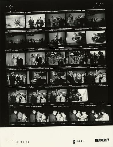 | Keywords: Ford B1995 NLGRF photo contact sheet (1976-10-24)(Gerald Ford Library).jpg White House Photographic Office WHPO is housed at the Gerald R Ford Presidential Library a branch of the National Archives and Records Administration NARA <br/><br/> This file is a 200 dpi photo contact sheet having images from roll of film B1995 of the August 9 1974 - January 20 1977 Gerald R Ford White House Photographic Office Series A0001-A9999 and B0001-B2886 photographs <br/><br/> The date on the photo contact sheet is the date the roll of film was processed not necessarily the date the photographs were taken See table below for additional details 1976-10-24 Gerald R Ford Presidential Library Image http //www fordlibrarymuseum gov/library/whphotos/B1995_NLGRF jpg B1995_NLGRF jpg from http //www fordlibrarymuseum gov/library/whphotos/19761024whpo pdf White House Photographs October 24 1976 of the http //www fordlibrarymuseum gov/Library/whphotos/whpo asp White House Photographic Collection page White House Photographic Office WHPO <br/> Creator David Hume Kennerly PD-USGov Institution Institution Gerald R Ford Presidential Library Table wikitable sortable + Photo contact sheet B1995 U S President Ford Administration Gerald R Ford Library Frame s Tone Subject proper Subject generic Names Geographic Location Photographer Date - 2A BW Campaign Trip to California - Prior to Interview with Joe Garagiola Edith Green and Steve Ford Steve in foreground clowning for camera; GRF in background standing smoking pipe GRF Steve Ford Los Angeles CA KABC-TV Studio -Green Room Kennerly 1976-10-24 - 3A BW Campaign Trip to California - Prior to Interview with Joe Garagiola Edith Green and Steve Ford greeting handshaking GRF Joe Garagiola Los Angeles CA KABC-TV Studio Kennerly 1976-10-24 - 4A-5A BW Campaign Trip to California - Prior to Interview with Joe Garagiola Edith Green and Steve Ford greeting handshaking standing talking GRF Joe Garagiola Edith Green Steve Ford Los Angeles CA KABC-TV Studio Kennerly 1976-10-24 - 6A-9A BW Campaign Trip to California - Interview with Joe Garagiola Edith Green and Steve Ford GRF Steve Garagiola Green seated in background around coffee table; technicians in foreground; various angles and distances GRF Joe Garagiola Edith Green Steve Ford; Studio Technicians Los Angeles CA KABC-TV Studio Kennerly 1976-10-24 - 10A-11A BW Campaign Trip to California - Interview with Joe Garagiola Edith Green and Steve Ford -Columnist embracing offstage Rona Barrett Unidentified Man Los Angeles CA KABC-TV Studio Kennerly 1976-10-24 - 12A-13A BW Campaign Trip to California - Following Interview with Joe Garagiola Edith Green and Steve Ford standing posing GRF Unidentified Man Los Angeles CA KABC-TV Studio -Green Room Kennerly 1976-10-24 - 14A-15A BW Campaign Trip to California - Following Interview with Joe Garagiola Edith Green and Steve Ford - Columnist standing talking; Steve wearing jeans down jacket and cowboy hat; crowd in background Steve Ford Rona Barrett; Crowd Los Angeles CA KABC-TV Studio -Outside Kennerly 1976-10-24 - 16A-20A BW Campaign Trip to California - Following Interview with Joe Garagiola Edith Green and Steve Ford - Columnist standing talking GRF Rona Barrett Los Angeles CA KABC-TV Studio -Outside Kennerly 1976-10-24 - 21A-24A BW Campaign Trip to California - Following Interview with Joe Garagiola Edith Green and Steve Ford standing talking; all may not be in every frame GRF Edith Green Others Green's Family Los Angeles CA KABC-TV Studio -Outside Kennerly 1976-10-24 - 25A BW Campaign Trip to California - Following Interview with Joe Garagiola Edith Green and Steve Ford - Columnist standing by limousine; Barrett putting head inside open door; Steve wearing jeans down jacket and cowboy hat Steve Ford Rona Barrett Keiser Los Angeles CA KABC-TV Studio -Outside Kennerly 1976-10-24 - 26A BW Kennerly 1976-10-24 - 27A-31A BW Campaign Trip to California - Arrival in San Diego CA greeting handshaking GRF Unidentified Family San Diego CA Lindbergh Field Kennerly 1976-10-24 Gerald R Ford Presidential Library and Museum-cooperation PD-USGov Contact sheets by the Ford White House October 1976 Photographs by David Hume Kennerly from 1976 |