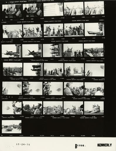 | Keywords: Ford B1996 NLGRF photo contact sheet (1976-10-24)(Gerald Ford Library).jpg White House Photographic Office WHPO is housed at the Gerald R Ford Presidential Library a branch of the National Archives and Records Administration NARA <br/><br/> This file is a 200 dpi photo contact sheet having images from roll of film B1996 of the August 9 1974 - January 20 1977 Gerald R Ford White House Photographic Office Series A0001-A9999 and B0001-B2886 photographs <br/><br/> The date on the photo contact sheet is the date the roll of film was processed not necessarily the date the photographs were taken See table below for additional details 1976-10-24 Gerald R Ford Presidential Library Image http //www fordlibrarymuseum gov/library/whphotos/B1996_NLGRF jpg B1996_NLGRF jpg from http //www fordlibrarymuseum gov/library/whphotos/19761024whpo pdf White House Photographs October 24 1976 of the http //www fordlibrarymuseum gov/Library/whphotos/whpo asp White House Photographic Collection page White House Photographic Office WHPO <br/> Creator David Hume Kennerly PD-USGov Institution Institution Gerald R Ford Presidential Library Table wikitable sortable + Photo contact sheet B1996 U S President Ford Administration Gerald R Ford Library Frame s Tone Subject proper Subject generic Names Geographic Location Photographer Date - 1-2 BW Campaign Trip to California seated ariund breakfast table; eating talking GRF Cheney Joe Garagiola Unidentified Man Pasadena CA Huntington-Sheraton Inn - Porteous Cottage Kennerly 1976-10-24 - 3 BW Campaign Trip to California; Arrival for Campaign Rally in Fountain Valley -Fountain Valley California GRF standing waving in limousine in background; secret service car in foreground; fire engine on right; going under large flag GRF Secret Service Firemen Others Fountain Valley CA Street Kennerly 1976-10-24 - 4-6 BW Campaign Trip to California; Prior to Campaign Rally in Fountain Valley; Actor - Fountain Valley California walking waving GRF John Wayne Fountain Valley CA Fountain Valley Recreation Center Kennerly 1976-10-24 - 7-9 BW Campaign Trip to California; Prior to Campaign Rally in Fountain Valley; Actor - Fountain Valley California greeting handshaking on stage; all not in every frame GRF John Wayne; Platform Guests Fountain Valley CA Fountain Valley Recreation Center Kennerly 1976-10-24 - 10-12 BW Campaign Trip to California; Campaign Rally in Fountain Valley - Fountain Valley California standing on stage both arms raised over head waving various angles GRF Crowd Fountain Valley CA Fountain Valley Recreation Center Kennerly 1976-10-24 - 13 BW Campaign Trip to California; Campaign Rally in Fountain Valley; Actor - Fountain Valley California standing on stage for anthem; GRF with hand over heart GRF John Wayne; Platform Guests Fountain Valley CA Fountain Valley Recreation Center Kennerly 1976-10-24 - 14-17 BW Campaign Trip to California; Campaign Rally in Fountain Valley; Actor - Fountain Valley California GRF at lectern waving speaking; various angles and distances; all not in every frame GRF John Wayne; Platform Guests Fountain Valley CA Fountain Valley Recreation Center Kennerly 1976-10-24 - 18-23 BW Campaign Trip to California; Campaign Rally in Fountain Valley; Actor - Fountain Valley California walking; red white and blue hot air balloon in air in background GRF John Wayne; Others Fountain Valley CA Fountain Valley Recreation Center Kennerly 1976-10-24 - 24-27 BW Campaign Trip to California; Campaign Rally in Fountain Valley; Actor - Fountain Valley California walking greeting handshaking talking; red white and blue hot air balloon in air in background; all not in every frame GRF John Wayne; Crowd Fountain Valley CA Fountain Valley Recreation Center Kennerly 1976-10-24 - 28-31 BW Campaign Trip to California; Following Campaign Rally in Fountain Valley; Actor -Fountain Valley California GRF seated on limousine roof speaking holding microphone; Wayne standing up through sun roof; various angles and distances; all not in every frame GRF John Wayne; Crowd Fountain Valley CA Fountain Valley Recreation Center Kennerly 1976-10-24 Gerald R Ford Presidential Library and Museum-cooperation PD-USGov Contact sheets by the Ford White House October 1976 Photographs by David Hume Kennerly from 1976 |