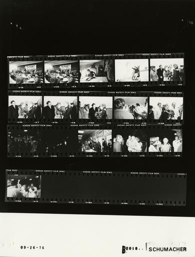 | Keywords: Ford B2018 NLGRF photo contact sheet (1976-10-21)(Gerald Ford Library).jpg White House Photographic Office WHPO is housed at the Gerald R Ford Presidential Library a branch of the National Archives and Records Administration NARA <br/><br/> This file is a 200 dpi photo contact sheet having images from roll of film B2018 of the August 9 1974 - January 20 1977 Gerald R Ford White House Photographic Office Series A0001-A9999 and B0001-B2886 photographs <br/><br/> The date on the photo contact sheet is the date the roll of film was processed not necessarily the date the photographs were taken See table below for additional details 1976-10-21 Gerald R Ford Presidential Library Image http //www fordlibrarymuseum gov/library/whphotos/B2018_NLGRF jpg B2018_NLGRF jpg from http //www fordlibrarymuseum gov/library/whphotos/19761021whpo pdf White House Photographs October 21 1976 of the http //www fordlibrarymuseum gov/Library/whphotos/whpo asp White House Photographic Collection page White House Photographic Office WHPO - Schumacher PD-USGov Institution Institution Gerald R Ford Presidential Library Table wikitable sortable + Photo contact sheet B2018 U S President Ford Administration Gerald R Ford Library Frame s Tone Subject proper Subject generic Names Geographic Location Photographer Date - 1A-2A BW Betty Ford Campaign Trip to Iowa; Campaign Rally for Congressional Candidate Jim Leach - Bettendorf Iowa BF speaking gesturing at microphone on stage; platform guests seated in background; crowd in foreground Betty Ford Jim Leach Gov Ray Platform Guests Crowd Bettendorf IA Jim Leach Headquarters Schumacher 1976-10-21 - 3A BW Betty Ford Campaign Trip - Flight from Iowa to Cleveland Ohio Weidenfeld and woman seated at table; man standing next to table wearing plaid suit head not in picture Weidenfeld Unidentified Woman Man C-9 aircraft DC9 Schumacher 1976-10-21 - 4A BW Betty Ford Campaign Trip to Ohio - Arrival in Cleveland standing waving in doorway of C-9 aircraft DC-9 Betty Ford Cleveland OH Cleveland-Hopkins Airport Schumacher 1976-10-21 - 5A-10A BW Betty Ford Campaign Trip to Ohio - Arrival in Cleveland greeting handshaking at base of steps from C-9 aircraft DC-9 ; BF presented and holding bouquet of flowers; various angles and distances; all not in every frame Betty Ford Welcoming Committee Cleveland OH Cleveland-Hopkins Airport Schumacher 1976-10-21 - 11A-13A BW Betty Ford Campaign Trip to Ohio - Lakewood Republican Dinner BF entering room waving walking behind head table; various angles and distances; all not in every frame Betty Ford Others Lakewood OH Lakewood City Hall Schumacher 1976-10-21 - 14A-16A BW Betty Ford Campaign Trip to Ohio - Rally for Ohio President Ford Committee PFC Volunteers BF greeting handshaking embracing outside hotel entering room waving in last frame; various angles and distances; all not in every frame Betty Ford Ohio President Ford Committee PFC Volunteers Cleveland OH Cleveland Marriott Inn Schumacher 1976-10-21 Gerald R Ford Presidential Library and Museum-cooperation PD-USGov Contact sheets by the Ford White House October 1976 |