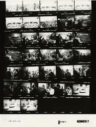 | Keywords: Ford B2027 NLGRF photo contact sheet (1976-10-27)(Gerald Ford Library).jpg White House Photographic Office WHPO is housed at the Gerald R Ford Presidential Library a branch of the National Archives and Records Administration NARA <br/><br/> This file is a 200 dpi photo contact sheet having images from roll of film B2027 of the August 9 1974 - January 20 1977 Gerald R Ford White House Photographic Office Series A0001-A9999 and B0001-B2886 photographs <br/><br/> The date on the photo contact sheet is the date the roll of film was processed not necessarily the date the photographs were taken See table below for additional details 1976-10-27 Gerald R Ford Presidential Library Image http //www fordlibrarymuseum gov/library/whphotos/B2027_NLGRF jpg B2027_NLGRF jpg from http //www fordlibrarymuseum gov/library/whphotos/19761027whpo pdf White House Photographs October 27 1976 of the http //www fordlibrarymuseum gov/Library/whphotos/whpo asp White House Photographic Collection page White House Photographic Office WHPO <br/> Creator David Hume Kennerly PD-USGov Institution Institution Gerald R Ford Presidential Library Table wikitable sortable + Photo contact sheet B2027 U S President Ford Administration Gerald R Ford Library Frame s Tone Subject proper Subject generic Names Geographic Location Photographer Date - 2A-9A BW Campaign Trip to New Jersey - Rally on the Boardwalk Atlantic City GRF at lectern speaking; various angles and distances; all not in every frame GRF Howard Haneman Joseph Lazarow Miss America Dorothy Benham Alfred Mr Marks Crowd Atlantic City NJ Haddon Hall Hotel - Boardwalk in Front Kennerly 1976-10-27 - 10A BW Campaign Trip to New Jersey - Prior to 24th Annual New Jersey School Boards Association Convention standing posing; backlit GRF Unidentified Man Boy Atlantic City NJ Haddon Hall Hotel - Holding Room Kennerly 1976-10-27 - 11A-12A BW Campaign Trip to New Jersey - 24th Annual New Jersey School Boards Association Convention GRF entering room waving in 1st frame; speaking from stage in 2nd frame; long shots from left of stage GRF New Jersey School Boards Association Members Atlantic City NJ Haddon Hall Hotel - Pennsylvania Ballroom Kennerly 1976-10-27 - 13A-15A BW Flight from Atlanto City New Jersey to Philadelphia PA seated standing around table; talking; all not in every frame Cheney Cavaney Hyland Ingersoll Schneider Others Air Force One Kennerly 1976-10-27 - 16A-17A BW Campaign Trip to Pennsylvania; Rally at Villanova University - Villanova Pennsylvania GRF at lectern speaking; higher vantage point long shots from right of stage GRF J Cleary A Donato Sen Schweiker Rev J Driscoll J Nolan Jack Ford Rep Schulze Fr Deegan; Crowd Villanova PA Villanova University Fieldhouse Kennerly 1976-10-27 - 18A-20A BW Campaign Trip to Pennsylvania; Following Rally at Villanova University - Villanova Pennsylvania greeting handshaking talking; Jack kissing coed in frame 20A Jack Ford Students Villanova PA Villanova University Fieldhouse Kennerly 1976-10-27 - 21A-22A BW Campaign Trip to Pennsylvania; Meeting with Villanova University Student Leaders - Villanova Pennsylvania standing talking greeting handshaking; all not in frames GRF Rev Driscoll Villanova Student Leaders; Others Villanova PA Villanova University Fieldhouse - Holding Rooms A B Kennerly 1976-10-27 - 23A-25A BW Campaign Trip to Pennsylvania - Prior to Meeting with Head of the Archdiocese of Philadelphia greeting handshaking; GRF and Jack not in every frame GRF Jack Ford John Cardinal Krol Philadelphia PA Cardinal Krol's Residence - Outside Kennerly 1976-10-27 - 26A-30A BW Campaign Trip to Pennsylvania - Prior to WPVI-TV Interview greeting handshaking talking; all not in every frame GRF Others Philadelphia PA WPVI-TV Studios Kennerly 1976-10-27 - 31A-33A BW Campaign Trip to Pennsylvania - WPVI-TV Interview GRF and Kane doing interview; Pellegrino seated to side; long shots from right of GRF GRF Larry Kane Joe Pellegrino; Technicians Philadelphia PA WPVI-TV Studios - Studio 1 Kennerly 1976-10-27 Gerald R Ford Presidential Library and Museum-cooperation PD-USGov Contact sheets by the Ford White House October 1976 Photographs by David Hume Kennerly from 1976 |