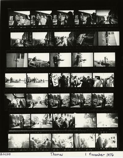 | Keywords: Ford B2123 NLGRF photo contact sheet (1976-11-01)(Gerald Ford Library).jpg White House Photographic Office WHPO is housed at the Gerald R Ford Presidential Library a branch of the National Archives and Records Administration NARA <br/><br/> This file is a 200 dpi photo contact sheet having images from roll of film B2123 of the August 9 1974 - January 20 1977 Gerald R Ford White House Photographic Office Series A0001-A9999 and B0001-B2886 photographs <br/><br/> The date on the photo contact sheet is the date the roll of film was processed not necessarily the date the photographs were taken See table below for additional details 1976-11-01 Gerald R Ford Presidential Library Image http //www fordlibrarymuseum gov/library/whphotos/B2123_NLGRF jpg B2123_NLGRF jpg from http //www fordlibrarymuseum gov/library/whphotos/19761101whpo pdf White House Photographs November 1 1976 of the http //www fordlibrarymuseum gov/Library/whphotos/whpo asp White House Photographic Collection page White House Photographic Office WHPO - Thomas PD-USGov Institution Institution Gerald R Ford Presidential Library Table wikitable sortable + Photo contact sheet B2123 U S President Ford Administration Gerald R Ford Library Frame s Tone Subject proper Subject generic Names Geographic Location Photographer Date - 3A-6A Color Campaign Trip to Ohio - Prior to Departure for Akron-Canton Airport greeting handshaking standing talking; all not in every frame GRF Unidentified women Canton OH Sheraton Belden Inn -Outside Thomas 1976-11-01 - 7A-10A Color Campaign Trip to Ohio - Arrival at Akron-Canton Airport GRF stepping from limousine; greeting handshaking walking waving; all not in every frame GRF Others Akron/Canton OH Akron-Canton Airport - Firestone Hangar Thomas 1976-11-01 - 11A Color Campaign Trip to Ohio - Campaign Rally at the Akron-Canton Airport standing talking handshaking; taken from lower vantage point; portion of sign ound in background GRF Unidentified Man Akron/Canton OH Akron-Canton Airport - Firestone Hangar Thomas 1976-11-01 - 12A-13A Color Campaign Trip to Ohio - Campaign Rally at the Akron-Canton Airport running outside hangar Cheney Akron/Canton OH Akron-Canton Airport Thomas 1976-11-01 - 14A Color Campaign Trip to Ohio - Motorcade to Air Force One Following Campaign Rally at the Akron-Canton Airport seated on roof of limousine back to camera; handshaking GRF Crowd Akron/Canton OH Akron-Canton Airport Thomas 1976-11-01 - 15A-17A Color Campaign Trip to Ohio - Motorcade to Air Force One Following Campaign Rally at the Akron-Canton Airport GRF standing on roof of limousine back to camera; taken from behind; long range GRF Crowd Akron/Canton OH Akron-Canton Airport Thomas 1976-11-01 - 18A-19A Color Campaign Trip to Ohio - Prior to Departure for Port Columbus International Airport standing behind banner; GRF waving in 2nd frame GRF Unidentified People Akron/Canton OH Akron-Canton Airport Thomas 1976-11-01 - 20A-22A Color Campaign Trip to Ohio - Arrival at Port Columbus International Airport greeting handshaking waving; woman holding sign with buckeye in 1st frame GRF Crowd Columbus OH Port Columbus International Airport Thomas 1976-11-01 - 23A Color Campaign Trip to Ohio - Prior to Campaign Rally at the Ohio State Capitol awaiting arrival of GRF Crowd Columbus OH Ohio State Capitol Thomas 1976-11-01 - 24A-29A Color Campaign Trip to Ohio - Campaign Rally at the Ohio State Capitol GRF on lectern waving; back to camera in most frames; various angles and distances; all not in every frame GRF Crowd Columbus OH Ohio State Capitol Thomas 1976-11-01 - 30A-37 Color Campaign Trip to Ohio - Campaign Rally at the Ohio State Capitol greeting handshaking standing talking; all not in every frame GRF Crowd Band Members Columbus OH Ohio State Capitol Thomas 1976-11-01 Gerald R Ford Presidential Library and Museum-cooperation PD-USGov Contact sheets by the Ford White House November 1976 |