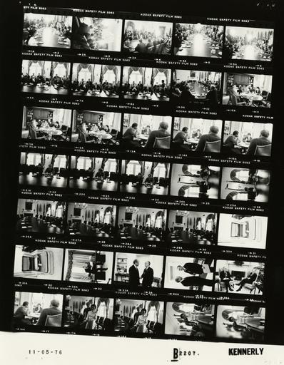 | Keywords: Ford B2207 NLGRF photo contact sheet (1976-11-05)(Gerald Ford Library).jpg White House Photographic Office WHPO is housed at the Gerald R Ford Presidential Library a branch of the National Archives and Records Administration NARA <br/><br/> This file is a 200 dpi photo contact sheet having images from roll of film B2207 of the August 9 1974 - January 20 1977 Gerald R Ford White House Photographic Office Series A0001-A9999 and B0001-B2886 photographs <br/><br/> The date on the photo contact sheet is the date the roll of film was processed not necessarily the date the photographs were taken See table below for additional details 1976-11-05 Gerald R Ford Presidential Library Image http //www fordlibrarymuseum gov/library/whphotos/B2207_NLGRF jpg B2207_NLGRF jpg from http //www fordlibrarymuseum gov/library/whphotos/19761105whpo pdf White House Photographs November 5 1976 of the http //www fordlibrarymuseum gov/Library/whphotos/whpo asp White House Photographic Collection page White House Photographic Office WHPO <br/> Creator David Hume Kennerly PD-USGov Institution Institution Gerald R Ford Presidential Library Table wikitable sortable + Photo contact sheet B2207 U S President Ford Administration Gerald R Ford Library Frame s Tone Subject proper Subject generic Names Geographic Location Photographer Date - 2-6 BW Prior to Cabinet Meeting seated around table; media standing along sides shooting photos or motion picture film; various angles and distances; all not in every frame GRF Rockefeller Secs Kissinger Simon Rumsfeld Levi Kleppe Knebel Usery Mathews Hills Coleman Vetter; Buchen Dent Lynn Hartmann Marsh Scranton Baroody Cannon Cheney Cavanaugh Connor Greenspan Nessen Scowcroft Seidman Raoul-Duval Bush Smith Jones Media Cabinet Room Kennerly 1976-11-05 - 7-10 BW Cabinet Meeting seated around table; various angles and distances; all not in every frame GRF Rockefeller Secs Kissinger Simon Rumsfeld Levi Kleppe Knebel Usery Mathews Hills Coleman Vetter; Buchen Dent Lynn Hartmann Marsh Scranton Baroody Cannon Cheney Cavanaugh Connor Greenspan Nessen Scowcroft Seidman Raoul-Duval Bush Smith Jones Cabinet Room Kennerly 1976-11-05 - 11-17 BW Unidentified Meeting seated around small round table talking; Cheney smoking cigarette Cheney Marsh Unidentified Man Cheney's Office Kennerly 1976-11-05 - 18-21 BW standing posing near table Steve Ford Nell Yates Cabinet Room Kennerly 1976-11-05 - 22-30 BW Friend of Steve Ford seated at table; various angles and distances Steve Ford Kevin Kennedy Cabinet Room Kennerly 1976-11-05 - 31-32 BW President's briefcase open and empty on chair Scheduling and Advance Office Kennerly 1976-11-05 - 33 BW Prior to Meeting with Senator Mansfield seated on front of desk reading documents GRF Oval Office Kennerly 1976-11-05 - 33-34 BW Meeting with Senator from Montana greeting handshaking standing talking; close ups GRF Sen Mansfield Oval Office Kennerly 1976-11-05 - 35 BW Meeting with Senator from Montana seated near fireplace talking; mid-range shot GRF Sen Mansfield Oval Office Kennerly 1976-11-05 Gerald R Ford Presidential Library and Museum-cooperation PD-USGov Contact sheets by the Ford White House November 1976 Photographs by David Hume Kennerly from 1976 |