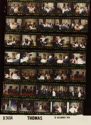 | Keywords: Ford B2484 NLGRF photo contact sheet (1976-12-11)(Gerald Ford Library).jpg White House Photographic Office WHPO is housed at the Gerald R Ford Presidential Library a branch of the National Archives and Records Administration NARA <br/><br/> This file is a 200 dpi photo contact sheet having images from roll of film B2484 of the August 9 1974 - January 20 1977 Gerald R Ford White House Photographic Office Series A0001-A9999 and B0001-B2886 photographs <br/><br/> The date on the photo contact sheet is the date the roll of film was processed not necessarily the date the photographs were taken See table below for additional details 1976-12-11 Gerald R Ford Presidential Library Image http //www fordlibrarymuseum gov/library/whphotos/B2484_NLGRF jpg B2484_NLGRF jpg from http //www fordlibrarymuseum gov/library/whphotos/19761211whpo pdf White House Photographs December 11 1976 of the http //www fordlibrarymuseum gov/Library/whphotos/whpo asp White House Photographic Collection page White House Photographic Office WHPO - Thomas PD-USGov Institution Institution Gerald R Ford Presidential Library Table wikitable sortable + Photo contact sheet B2484 U S President Ford Administration Gerald R Ford Library Frame s Tone Subject proper Subject generic Names Geographic Location Photographer Date - 3-13 Color Dinner for the Secretary of Defense Service Secretaries Joint Chiefs of Staff and Commanders of the Unified Commands seated around tables; eating talking; various angles and distances; all not in every frame; formal wear GRF Betty Ford Rumsfeld Scowcroft Clements Martin R Hoffmann Reed Gens G Brown Jones D Brown Rogers Wilson Hennesey James Daugherty Huyser; Lt Gen McAuliffe; Adms Holloway Siler Kidd Weisner; Hyland; Spouses State Dining Room Thomas 1976-12-11 - 14-16 Color Dinner for the Secretary of Defense Service Secretaries Joint Chiefs of Staff and Commanders of the Unified Commands standing; GRF and Clements handshaking talking; others seated in foreground; formal wear GRF Rumsfeld Clements Others State Dining Room Thomas 1976-12-11 - 17 Color Dinner for the Secretary of Defense Service Secretaries Joint Chiefs of Staff and Commanders of the Unified Commands Clements standing speaking; others seated; all not in frame; formal wear GRF Betty Ford Rumsfeld Scowcroft Clements Martin R Hoffmann Reed Gens G Brown Jones D Brown Rogers Wilson Hennesey James Daugherty Huyser; Lt Gen McAuliffe; Adms Holloway Siler Kidd Weisner; Hyland; Spouses State Dining Room Thomas 1976-12-11 - 18 Color Dinner for the Secretary of Defense Service Secretaries Joint Chiefs of Staff and Commanders of the Unified Commands GRF and Rumsfeld standing talking in background; others seated in foreground; formal wear GRF Betty Ford Rumsfeld Scowcroft Clements Martin R Hoffmann Reed Gens G Brown Jones D Brown Rogers Wilson Hennesey James Daugherty Huyser; Lt Gen McAuliffe; Adms Holloway Siler Kidd Weisner; Hyland; Spouses State Dining Room Thomas 1976-12-11 - 19-21 Color Dinner for the Secretary of Defense Service Secretaries Joint Chiefs of Staff and Commanders of the Unified Commands GRF standing speaking in background; others seated in foreground; various angles; all not in every frame; formal wear GRF Betty Ford Rumsfeld Scowcroft Clements Martin R Hoffmann Reed Gens G Brown Jones D Brown Rogers Wilson Hennesey James Daugherty Huyser; Lt Gen McAuliffe; Adms Holloway Siler Kidd Weisner; Hyland; Spouses State Dining Room Thomas 1976-12-11 - 22-26 Color Dinner for the Secretary of Defense Service Secretaries Joint Chiefs of Staff and Commanders of the Unified Commands seated eating; various angles and distances; all not in every frame ; formal wear GRF Betty Ford Rumsfeld Scowcroft Clements Martin R Hoffmann Reed Gens G Brown Jones D Brown Rogers Wilson Hennesey James Daugherty Huyser; Lt Gen McAuliffe; Adms Holloway Siler Kidd Weisner; Hyland; Spouses State Dining Room Thomas 1976-12-11 - 27-29 Color Entertainment at Dinner for the Secretary of Defense Service Secretaries Joint Chiefs of Staff and Commanders of the Unified Commands performing singing Navy Sea Chanters Cross Hall Thomas 1976-12-11 - 30-32 Color Reception Following Dinner for the Secretary of Defense Service Secretaries Joint Chiefs of Staff and Commanders of the Unified Commands greeting handshaking talking mingling; all not in frames; formal wear GRF Betty Ford Rumsfeld Scowcroft Clements Martin R Hoffmann Reed Gens G Brown Jones D Brown Rogers Wilson Hennesey James Daugherty Huyser; Lt Gen McAuliffe; Adms Holloway Siler Kidd Weisner; Hyland; Spouses State Dining Room Thomas 1976-12-11 - 33 Color Reception Following Dinner for the Secretary of Defense Service Secretaries Joint Chiefs of Staff and Commanders of the Unified Commands standing talking near nativity Set; formal wear Betty Ford Rumsfeld State Dining Room Thomas 1976-12-11 - 34-37 Color Entertainment at Dinner for the Secretary of Defense Service Secretaries Joint Chiefs of Staff and Commanders of the Unified Commands dancing talking standing; all not in frames; formal wear GRF Betty Ford Rumsfeld Scowcroft Clements Martin R Hoffmann Reed Gens G Brown Jones D Brown Rogers Wilson Hennesey James Daugherty Huyser; Lt Gen McAuliffe; Adms Holloway Siler Kidd Weisner; Hyland; Spouses Entrance Hall/Grand Hall Thomas 1976-12-11 Gerald R Ford Presidential Library and Museum-cooperation PD-USGov Contact sheets by the Ford White House December 1976 |