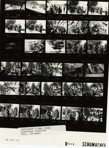 | Keywords: Ford B2613 NLGRF photo contact sheet (1976-12-27)(Gerald Ford Library).jpg White House Photographic Office WHPO is housed at the Gerald R Ford Presidential Library a branch of the National Archives and Records Administration NARA <br/><br/> This file is a 200 dpi photo contact sheet having images from roll of film B2613 of the August 9 1974 - January 20 1977 Gerald R Ford White House Photographic Office Series A0001-A9999 and B0001-B2886 photographs <br/><br/> The date on the photo contact sheet is the date the roll of film was processed not necessarily the date the photographs were taken See table below for additional details 1976-12-27 Gerald R Ford Presidential Library Image http //www fordlibrarymuseum gov/library/whphotos/B2613_NLGRF jpg B2613_NLGRF jpg from http //www fordlibrarymuseum gov/library/whphotos/19761227whpo pdf White House Photographs December 27 1976 of the http //www fordlibrarymuseum gov/Library/whphotos/whpo asp White House Photographic Collection page White House Photographic Office WHPO - Schumacher PD-USGov Institution Institution Gerald R Ford Presidential Library Table wikitable sortable + Photo contact sheet B2613 U S President Ford Administration Gerald R Ford Library Frame s Tone Subject proper Subject generic Names Geographic Location Photographer Date - 3-4 BW Trip to Colorado - Christmas and Skiing Vacation in Vail CO vehicles parked on either side; 1st frame through windshield of moving vehicle 2nd through rear window People standing on Road Vail CO Snowy Road Schumacher 1976-12-27 - 5-9 BW Trip to Colorado - Christmas Skiing Vacation in Vail CO - Prior to Party at Home of Mr Mrs John Murchison Jr greeting handshaking; standing talking; BF wearing fur coat; various angles and distances; all not in every frame GRF Betty Ford Others Vail CO John Murchison Residence - Outside Schumacher 1976-12-27 - 10-20 BW Trip to Colorado - Christmas Skiing Vacation in Vail CO - Party at Home of Mr Mrs John Murchison Jr standing talking sitting eating; various angles and distances; all not in every frame including GRF and BF GRF Betty Ford Others Vail CO John Murchison Residence Schumacher 1976-12-27 - 21 BW Trip to Colorado - Christmas Skiing Vacation in Vail CO - Party at Home of Mr Mrs John Murchison Jr standing talking; GRF holding paper cup GRF Others Vail CO John Murchison Residence Schumacher 1976-12-27 - 22-23 BW Trip to Colorado - Christmas Skiing Vacation in Vail CO - Party at Home of Mr Mrs John Murchison Jr seated talking near Christmas Tree; more people in background; taken from higher vantage point GRF Betty Ford Pepi Gramshammer Others Vail CO John Murchison Residence Schumacher 1976-12-27 - 24-30 BW Trip to Colorado - Christmas Skiing Vacation in Vail CO - Party at Home of Mr Mrs John Murchison Jr standing talking sitting eating; various angles and distances; all not in every frame including GRF and BF GRF Betty Ford Others Vail CO John Murchison Residence Schumacher 1976-12-27 - 31-32 BW Trip to Colorado - Christmas Skiing Vacation in Vail CO - Party at Home of Mr Mrs John Murchison Jr view of mountains through window Vail CO John Murchison Residence Schumacher 1976-12-27 Gerald R Ford Presidential Library and Museum-cooperation PD-USGov Contact sheets by the Ford White House December 1976 Fur garments Fur fashion in 1976 |