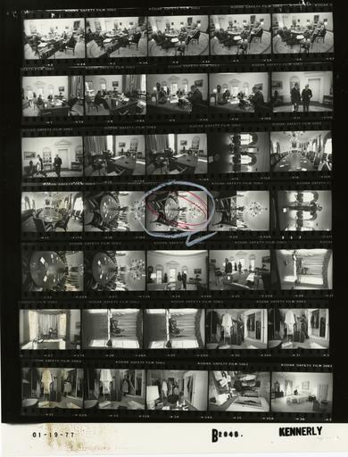 | Keywords: Ford B2845 NLGRF photo contact sheet (1977-01-19)(Gerald Ford Library).jpg White House Photographic Office WHPO is housed at the Gerald R Ford Presidential Library a branch of the National Archives and Records Administration NARA <br/><br/> This file is a 200 dpi photo contact sheet having images from roll of film B2845 of the August 9 1974 - January 20 1977 Gerald R Ford White House Photographic Office Series A0001-A9999 and B0001-B2886 photographs <br/><br/> The date on the photo contact sheet is the date the roll of film was processed not necessarily the date the photographs were taken See table below for additional details 1977-01-19 Gerald R Ford Presidential Library Image http //www fordlibrarymuseum gov/library/whphotos/B2845_NLGRF jpg B2845_NLGRF jpg from http //www fordlibrarymuseum gov/library/whphotos/19770119whpo pdf White House Photographs January 19 1977 of the http //www fordlibrarymuseum gov/Library/whphotos/whpo asp White House Photographic Collection page White House Photographic Office WHPO <br/> Creator David Hume Kennerly PD-USGov Institution Institution Gerald R Ford Presidential Library Table wikitable sortable + Photo contact sheet B2845 U S President Ford Administration Gerald R Ford Library Frame s Tone Subject proper Subject generic Names Geographic Location Photographer Date - 2-10 BW seated around desk; GRF and Buchen smoking pipes; various angles and distances GRF Cheney Buchen Oval Office Kennerly 1977-01-19 - 11-12 BW Meeting with United States Senator from Pennsylvania PA greeting handshaking standing talking; walking toward desk in 2nd frame GRF Sen Hugh Scott Oval Office Kennerly 1977-01-19 - 13-15 BW Meeting with United States Senator from Pennsylvania PA seated at desk; GRF smoking pipe GRF Sen Hugh Scott Oval Office Kennerly 1977-01-19 - 16-17 BW Photo Opportunity with Betty Ford in Cabinet Room seated in GRF's chair posing; various angles and distances Betty Ford Cabinet Room Kennerly 1977-01-19 - 18-21 BW Photo Opportunity with Betty Ford in Cabinet Room standing posing on Cabinet Room table; shoeless; various distances Betty Ford Cabinet Room Kennerly 1977-01-19 - 22-23 BW Photo Opportunity with Betty Ford in Cabinet Room seated crosslegged posing on Cabinet Room table; various distances Betty Ford Cabinet Room Kennerly 1977-01-19 - 24-25 BW standing talking; walking toward desk in frame 25 GRF Betty Ford Oval Office Kennerly 1977-01-19 - 26-29 BW GRF seated at desk; BF standing beside right arm on GRF's left shoulder; laughing smiling GRF Betty Ford Oval Office Kennerly 1977-01-19 - 30-35 BW Preparations for Moving out of White House on January 20 1977 removing clothing from closet; clothing racks on left of frame; opened and unopened suitcases stacked around room Betty Ford Second Floor - Closet in President and Mrs Ford's Bedroom Kennerly 1977-01-19 - 36 BW Preparations for Moving out of White House on January 20 1977 standing on other side of bed holding and looking at unidentified object; long shot from opposite side of room Betty Ford Second Floor - President and Mrs Ford's Bedroom Kennerly 1977-01-19 Gerald R Ford Presidential Library and Museum-cooperation PD-USGov Contact sheets by the Ford White House January 1977 Photographs by David Hume Kennerly from 1977 |
