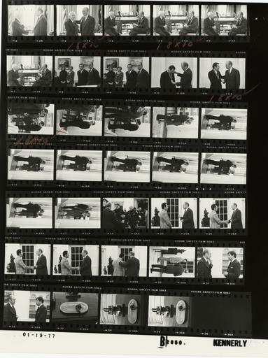 | Keywords: Ford B2850 NLGRF photo contact sheet (1977-01-19)(Gerald Ford Library).jpg White House Photographic Office WHPO is housed at the Gerald R Ford Presidential Library a branch of the National Archives and Records Administration NARA <br/><br/> This file is a 200 dpi photo contact sheet having images from roll of film B2850 of the August 9 1974 - January 20 1977 Gerald R Ford White House Photographic Office Series A0001-A9999 and B0001-B2886 photographs <br/><br/> The date on the photo contact sheet is the date the roll of film was processed not necessarily the date the photographs were taken See table below for additional details 1977-01-19 Gerald R Ford Presidential Library Image http //www fordlibrarymuseum gov/library/whphotos/B2850_NLGRF jpg B2850_NLGRF jpg from http //www fordlibrarymuseum gov/library/whphotos/19770119whpo pdf White House Photographs January 19 1977 of the http //www fordlibrarymuseum gov/Library/whphotos/whpo asp White House Photographic Collection page White House Photographic Office WHPO <br/> Creator David Hume Kennerly PD-USGov Institution Institution Gerald R Ford Presidential Library Table wikitable sortable + Photo contact sheet B2850 U S President Ford Administration Gerald R Ford Library Frame s Tone Subject proper Subject generic Names Geographic Location Photographer Date - 2-3 BW Meeting with Director Division of Naval Reactors Energy Research and Development Administration ERDA greeting handshaking standing talking; backlit GRF Adm Hyman Rickover Oval Office Kennerly 1977-01-19 - 4-7 BW Meeting with Director Division of Naval Reactors Energy Research and Development Administration ERDA seated in front of desk talking GRF Adm Hyman Rickover Oval Office Kennerly 1977-01-19 - 8-9 BW Prior to Medal of Freedom Presentation To Secretary of Defense Rumsfeld standing posing GRF Betty Ford Rumsfeld Joyce Rumsfeld Nicholas Rumsfeld Oval Office Kennerly 1977-01-19 - 10-11 BW Medal of Freedom Presentation To Secretary of Defense Rumsfeld standing; GRF pinning medal in 1st frame handshaking in 2nd GRF Rumsfeld Oval Office Kennerly 1977-01-19 - 12-14 BW Medal of Freedom Presentation To Secretary of Defense Rumsfeld standing talking smiling; all not in every frame; Donald and Nicholas standing together GRF Rumsfeld Nicholas Rumsfeld Gen David Jones Sen Brock Others Oval Office Kennerly 1977-01-19 - 15 BW Following Medal of Freedom Presentation To Secretary of Defense Rumsfeld standing posing; taken from right GRF Betty Ford Oval Office Kennerly 1977-01-19 - 16-21 BW Following Medal of Freedom Presentation To Secretary of Defense Rumsfeld standing talking in doorway between Scheduling and Advance Office and Oval Office GRF Betty Ford Oval Office Kennerly 1977-01-19 - 22 BW Following Medal of Freedom Presentation To Secretary of Defense Rumsfeld standing kissing in doorway between Scheduling and Advance Office and Oval Office GRF Betty Ford Oval Office Kennerly 1977-01-19 - 23 BW Following Medal of Freedom Presentation To Secretary of Defense Rumsfeld standing in doorway between Scheduling and Advance Office and Oval Office; BF walking out of Oval Office GRF Betty Ford Oval Office Kennerly 1977-01-19 - 24 BW Photo Opportunity with US Park Police and DC Metropolitan Police walking into office from Colonnade GRF US Park Police S Fontaine G Ford J Bussard W Zeh G Delane M Healey J Radney P Harold Oval Office Kennerly 1977-01-19 - 25-30 BW standing talking handshaking; backs to camera GRF's arm on man's shoulder in 5th frame GRF Unidentified Man Oval Office Kennerly 1977-01-19 - 31-32 BW standing talking GRF O'Donnell Oval Office Kennerly 1977-01-19 - 33-35 BW pipes on desk; 1 in ashtray Oval Office Kennerly 1977-01-19 Gerald R Ford Presidential Library and Museum-cooperation PD-USGov Contact sheets by the Ford White House January 1977 Photographs by David Hume Kennerly from 1977 |