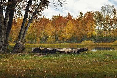 Keywords: forest autumn nature park lake gold trees bright beauty landscape log beach recreation hiking walking