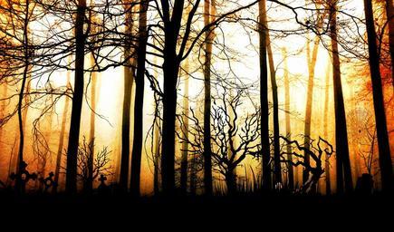 Keywords: forest dark fog gloomy mystical lighting trees composing mood light evening graves grave stones crosses silhouette atmosphere branches aesthetic weird creepy abendstimmung shadow back light