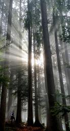 Keywords: forest fog light child nature trees mood colourless back light fog day mystical sunbeam