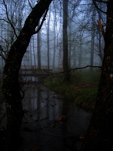 Keywords: forest fog tree glade bach bridge atmosphere weird backdrop black forest germany