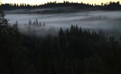 Keywords: forest fog wood undergrowth trees twilight nature landscape field mist against the light light gloomy worrisome frightening coniferous fir mountain dark hills canyon darkness wallpaper