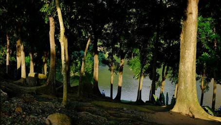 Keywords: forest lake foam fisherman tall trees stones landscape field nature tree branches green leaves the sun's rays sunny water serenity roots summer rest green calm tranquility hill wood undergrowth plants wallpaper