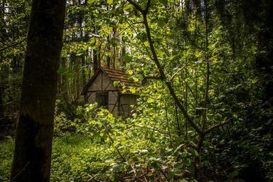 Keywords: forest leaving green witch's house lapsed trees hiking stone wall ruin weathered old