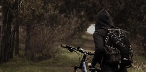 Keywords: forest man cyclist nature young outdoor tree walk woods exercise activity