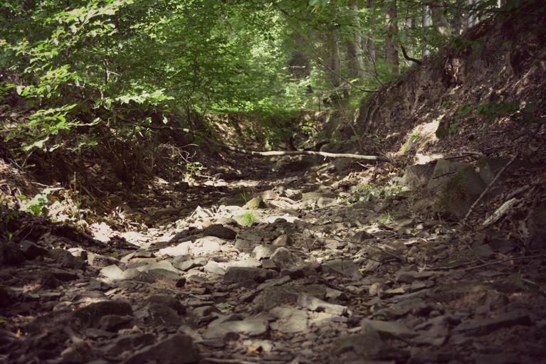 Keywords: forest riverbed stone nature landscape out old mystical leaves twilight light