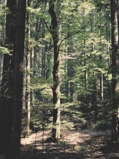 Keywords: forest tree foliage wood trunks environment season spring light branches outdoor plant nature scenic ecology growth woodland green