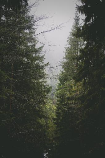 Keywords: forest trees conifers nature environment wood foggy misty green flora botany growth branches