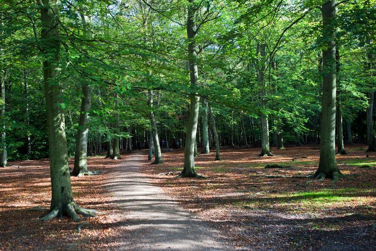 Keywords: forest woodland path autumn sunshine landscape nature foliage leaf litter brown