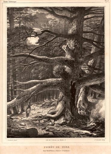 | Keywords: Forêt de pins.jpg es Litografía nº 42 del libro Histoire naturelle des îles Canaries 1 2 Les Miscellanées Canariennes Planches De Phillip Barker Webb y Sabin Berthelot En el grabado se observa un pinar de pino canario en la isla de La Palma durante la luna llena En el fondo a la izquierda se ve a un leñador talando un pino mientras que en la derecha se observa a otro durmiendo junto a una hoguera con un sombrero tapando su cara y envuelto en una capa Own archive C Adrien 1839 PD-old-100 Pinus canariensis |