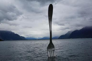 Keywords: fork lake trueb weather vevey switzerland sculpture modern art metal mountains landscape show water