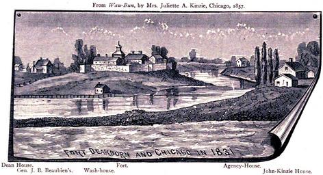 | Keywords: Fort Dearborn & Chicago in 1831.jpg I can not believe that Mrs Kinzie saw the picture until it appeared in her Wau-Bun It was probably engraved from a sketch by her and sent to her publishers without an opportunity for her correction It is certainly unlike the Fort and surroundings as I recollect them The view appears to be from the north-east as the enclosure of the Fort was nearly north and south east and west The River is intended to be shown inland probably not farther than Dearborn or Clark Streets as the Agency house was at the corner of North-Water and North-State Streets Fort Dearborn is represented as located on a high elevation much above the Kinzie House This is incorrect as the ground at the Foi t was not over eight feet above the River at its lowest stage while the Kinzie House was two or three feet higher than the Fort There was no sharp point in front of the Fort north as shown in the cut The slope to the River was gradual At no place fronting the north line of pickets was there over 80 feet to the water's edge; and at the narrowest point opposite the north gate from 50 to 60 feet The bend of the River westerly from the Fort was gradual The direction of the River from the bend westerly was almost straight to Franklin Street From Franklin Street it turned gradually southward to the junction of the north and south branches The point of junction of the two streams was in sight from the Kinzie House There was no sharp inlet in front of the Kinzie House as represented in the cut but there was a slight bend corresponding with the slight curve opposite The direction of the cut through the sand-bar and the piers erected conformed to the general course of the River at the Kinzie House The cut shows the Block- House to be the highest building It was considerably lower than the officers' or soldiers' quarters The brick building erected in about 1824 or '25 not shown in this cut was the most prominent structure It was located about 10 feet south of and parallel with the north picket and about 10 or 15 feet west of the north gate It was within the Fort enclosure and would partially hide in this view the officers' original quarters There was no fence along the River edge east of the stockade The Kinzie House was about 200 feet from the River with a piazza the whole length of its south front The yard in front was enclosed by a splitpicket fence Inside and close to the east-and-west fence was a row of Lombardy poplar trees From the piazza the inside of the Fort was visible through to the south gate G S Hubbard https //archive org/stream/earlychicagofort00wentiala page/86/mode/1up probably 1857 probably engraved from a sketch by Juliette Kinzie PD-old Fort Dearborn Chicago in the 1830s John Kinzie |