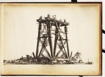 | Keywords: Forth Bridge - Fife from Village Pier (west side).jpg Photograph of Fife from Village Pier west side The riveting cages alluded to in the preceding picture can here again be seen on both the bottom members which were carried out to a distance of about 100 feet without any external support The upper ends of verticals are rapidly nearing each other which accounts for the lengths of box girder projecting on either side the shortening of which has already commenced as is evident from the eastern arm of same Transcription from Philip Phillips 'The Forth Railway Bridge' Edinburgh 1890 Size cm 43 58 exhibition history Institution National Library of Scotland photograph object history PD-old-70-1923 Creator Philip Phillips RB l 229 74570338 Forth Bridge - Fife from Village Pier west side Uploaded with GWToolset Forth Bridge - Fife from Village Pier west side http //deriv nls uk/56YK98Q/7443/74438668 2 jpg Construction of the Forth Bridge Images uploaded as part of NLS-WMUK collaboration |