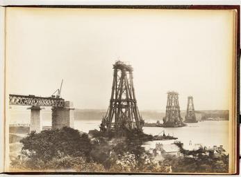 | Keywords: Forth Bridge - General view from North Queensferry hills depicting the three cantilevers at very nearly their full height.jpg Photograph of the Forth Bridge under construction general view from North Queensferry hills A view depicting the three cantilevers at very nearly their full height The rising ground some 100 feet above sea level at point from which it was taken being well adapted for securing a good position the artistic qualities and perspective of this picture leave nothing to be desired The foreground chiefly composed of foliage is somewhat hazy a result due to an almost imperceptible motion imparted to it by the wind though so far from detracting from it this feature adds to the general effect of one of the most successful pictures yet secured To the west of Inchgarvie may be seen what appear like a few sticks floating in the water which prove however under close inspection to be the most formidable Oregon spars no less than 100 feet in length and 3 feet in diameter strapped together with iron band in bundles of three each to form a protection to the piers on Inchgarvie As they were exceptionally fine spars their combined weight was considerable and offered much resistance to the rough water and strong down tides and therefore necessitated moorings of exceptional strength and character laid down in over 200 feet of water The essential part of these moorings was a block of concrete weighing some 30 tons surrounded by an iron frame the ribs of which projected and were turned at an angle thus forming a species of grapnel This is the fellow-picture to No 36 Transcription from Philip Phillips 'The Forth Railway Bridge' Edinburgh 1890 Size cm 43 58 exhibition history Institution National Library of Scotland photograph object history PD-old-70-1923 Creator Philip Phillips RB l 229 74570366 Forth Bridge - General view from North Queensferry hills depicting the three cantilevers at very nearly their full height Uploaded with GWToolset Forth Bridge - General view from North Queensferry hills depicting the three cantilevers at very nearly their full height http //deriv nls uk/56YK98Q/7443/74438682 2 jpg Construction of the Forth Bridge Images uploaded as part of NLS-WMUK collaboration |