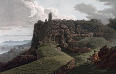 | Keywords: Fortifications at Larkoul (JW Edy plate 65).jpg Artwork Creator John William Edy en Fortifications at Larkoul No LXV FORTIFICATIONS AT LARKOUL From the present remains of these fortifications it appears that they were originally of no great extent but very strong and well adapted for defence and for the protection of the neighbouring inhabitants in case of need They are situated on the top of the continental rocks at the summit of a precipice having within range of their guns the whole of the harbour with its east and west entrances The interior is a quadrangle of which the area is about 400 square yards it is encompassed by a wall composed of large stones 20 feet thick well cemented with mortar appear ing on the three sides next the country to have been 20 feet high ; on the outside there is a broad moat or ditch at present nearly filled with the fragments of the dilapidated walls A strong embankment of stones and earth cannon proof rises on the inside to nearly the height of the ramparts It has only one entrance which is toward the village as may in its mutilated state be seen like a gap through the wall on the right of the picture The angular wall on the foreground extends entirely along the verge of the precipice exactly opposite the west entrance Part of the harbour and its east entrance are seen at the low point of the rock over the three houses beyond which is the Fiord and the large Isthmus near Mos from the point of which the ferry boat sails to the west of Norway as already mentioned I was surprised to find a place of such infinite importance in so neglected a state choaked up with rubbish and the well filled with stones There is no other harbour so safe on the Fiord when vessels have once entered and a little repair of the works would render it untenable for an enemy In one of the angles directly in front is seen the entrance to a small vaulted chamber with a remarkable perpendicular stone on its top of which a poor aged misanthrope has taken possession He is a cobbler by trade and has bestowed great pains and labour on his retreat to convert it into what he calls a dwelling which he has inhabited many years in solitary and miserable seclusion On each side of a door of rough boards an old broken glass casement with rags stuffed between the leads forms the window; in a corner is a heap of the dead leaves of the fir which is used as a bed over which an old piece of well-worn sailcloth forms the coverlid; two large stones which fell from the roof have supplied chair and table ; a small hearth with a hole above it for a chimney two crutches a hatchet and a clasp knife make up the the rest of the accommodations The wretched tenant carries his tattered wardrobe perpetually on his back with belts exactly according to the ancient Norwegian costume; his beard is perfectly white and long his eyes are good and his frame shews the remains of athletic strength ; he looks very like old Drakenberg who lived to the great age of 146 lxva 1 Drakenberg was totally blind in the latter part of his life and his age being doubted he angrily travelled on foot begging his way from Copenhagen to Drontheim and back again to obtain the register of his nativity and prove the fact On his return being vexed at the unbelief of his townsmen he indignantly threw down the paper with these emphatical words What do you think of me now 1 lxva The portrait of this patriarch is in our possession and he may be classed as the third old Man in Europe; viz Jenkins 169; Parr 152; Drakenberg 146 Collapse bottom http //urn nb no/URN NBN no-nb_digibok_2011072910001 Boydell's picturesque scenery of Norway London 1820 Plate no 65 p 333 in scanned copy no-nb_digibok_2011072910001 PD-Art-100 John William Edy Boydell's picturesque scenery of Norway Fortifications in Norway Larkollen Chimneys in Norway |