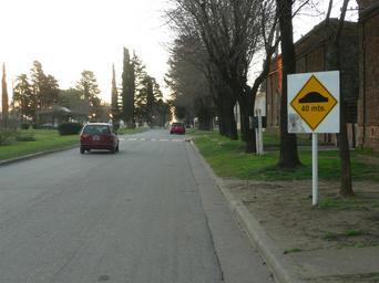 Keywords: Fortín Olavarría - boulevar Yrigoyen al 100, signo vial de calle con lomada, vista a la plaza central.JPG en Fortín Olavarría town Buenos Aires province Argentina 2014-08-07 18 21 40 own RoRo cc-zero Uploaded with UploadWizard Fortín Olavarría Road signs in Argentina