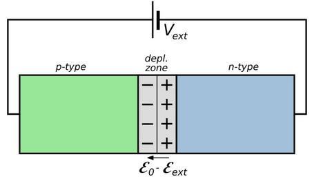 | Keywords: Forward-Biased pn Junction.svg Diagram of a pn junction under forward bias the resultant electric field <math>\mathcal E _0-\mathcal E _ ext </math> the depletion zone the space charges and the types of semiconductor Own drawing done in Inkscape 2007-02-20 inductiveload Reverse Biased pn Junction PN-junction diagrams |