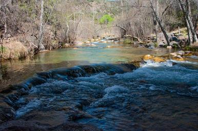 | Keywords: arizona coconino national forest coconinonationalforest forest service forestservice fossil creek fossilcreek red rock ranger district redrockrangerdistrict tonto national forest tontonationalforest usfs canyon creek forest outdoors riparian water camp verde campverde united states unitedstates outdoor landscape stream waterfall riverbed river watercourse Fossil Creek seems to appear out of nowhere, gushing 20,000 gallons a minute out of a series of springs at the bottom of a 1,600 foot deep canyon. Over the years these calcium laden waters have laid down huge deposits of a type of limestone called travertine. That rock-like substance encases whatever happens to fall into the streambed, forming the fossils for which the area is named. Fossil Creek is one of two "Wild and Scenic" rivers in Arizona. This special designation was achieved when the Irving power plant was decommissioned, and removal of flume and dam on the creek allowed this magnificent creek to once again flow freely through Arizona's arid landscape. Most people come to Fossil Creek to sunbathe, wade, hike and birdwatch. It's also a great place to take photographs. The lushness of the riparian area strikes a sharp contrast to the brittle desert that surrounds it. Increasing popularity has led to the Coconino and Tonto National Forests to implement a parking permit reservation system in 2016. Reserved parking permits give visitors the peace of mind knowing they'll have a spot waiting for them in this remote location. Many visitors drive two or three hours to get to the creek. The final descent to the creek at the bottom of a canyon is on an extremely rough, rocky jeep road. Photo by Deborah Lee Soltesz, March 2, 2016. Credit: USFS Coconino National Forest. Learn more about visiting Fossil Creek, Fossil Springs Wilderness, and the Coconino National Forest. Fossil Creek seems to appear out of nowhere, gushing 20,000 gallons a minute out of a series of springs at the bottom of a 1,600 foot deep canyon. Over the years these calcium laden waters have laid down huge deposits of a type of limestone called travertine. That rock-like substance encases whatever happens to fall into the streambed, forming the fossils for which the area is named. Fossil Creek is one of two "Wild and Scenic" rivers in Arizona. This special designation was achieved when the Irving power plant was decommissioned, and removal of flume and dam on the creek allowed this magnificent creek to once again flow freely through Arizona's arid landscape. Most people come to Fossil Creek to sunbathe, wade, hike and birdwatch. It's also a great place to take photographs. The lushness of the riparian area strikes a sharp contrast to the brittle desert that surrounds it. Increasing popularity has led to the Coconino and Tonto National Forests to implement a parking permit reservation system in 2016. Reserved parking permits give visitors the peace of mind knowing they'll have a spot waiting for them in this remote location. Many visitors drive two or three hours to get to the creek. The final descent to the creek at the bottom of a canyon is on an extremely rough, rocky jeep road. Photo by Deborah Lee Soltesz, March 2, 2016. Credit: USFS Coconino National Forest. Learn more about visiting Fossil Creek, Fossil Springs Wilderness, and the Coconino National Forest. |