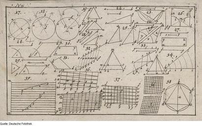 | Keywords: Fotothek df tg 0000219 Geometrie ^ Kreis ^ Dreieck ^ Viereck ^ Polygon ^ Instrument ^ Proportion.jpg Scan Deutsche Fotothek df_tg_0000219 color 2007 MIK-Center Berlin GmbH 88960219 Abbildung Nr 2 Nürnberg Konstruktion von Kreismittelpunkten Dreiecken Vierecken und Polygonen mit dem Zirkel Proportionale Streckenteilung Papier Kupferstich 8 7 x 14 5 cm Geometrie Kreis Dreieck Viereck Polygon Instrument Proportion ppn263671577 1687 Druck Deutsche Fotothek gefördert von der Deutschen Forschungsgemeinschaft Projekt Technikgeschichte 16 /17 Jh Verwalter Dresden Sächsische Landesbibliothek - Staats- und Universitätsbibliothek Dresden 3 A 8395 Herstellung Herstellung Riegel Christoph Knorz Andreas Verleger aus Stahl Georg Conrad Buch Georg Conrad Martii neu-aufgeführter Europäischer Ingenieur oder Kriegs-Bau-Kunst Wie solche mit allem was dazu erfordert wird in Europa üblich gewesen und zumaln annoch ist In sich haltend I Eine vollständige Geometrie II Eine ausführliche Fortification nemlich von Offensiv- und Defensiv-Wercken auch andern Militair-Gebäuden auf aller Europäischen Völcker Art vorgestellt und mit nöthigen Kupffern versehen Das II Capitel Von der Planigraphie oder Uffreissung der Figuren Das III Capittel Von Theilungen der Linien/ und zwar Erstlich der Geraden Das IV Capitel Von Theilungen der Circular-Linie/ oder/ worauf es folglich zu ziehen/ von Aufreissung der Polygonal oder vielseitigen Figur SLUB 3 A 8395 Fotothek-License PD-old-100 Old Manuscripts from the Deutsche Fotothek Geometrie Stereometrie Körper |