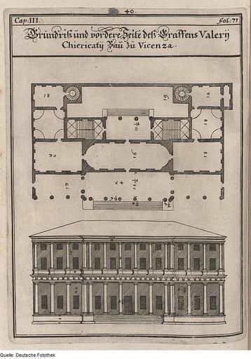 | Keywords: Fotothek df tg 0001656 Architektur ^ Bauwesen ^ Gebäude.jpg Scan Deutsche Fotothek df_tg_0001656 color 2007 MIK-Center Berlin GmbH 88961656 Kap 3 Fig 40 Bl 71 Nürnberg Grundriss und Vorderansicht des Palazzo Chiericati in Vicenza Papier Kupferstich 24 7 x 18 1 cm Architektur Bauwesen Gebäude ppn26553190X 1698 Druck Deutsche Fotothek gefördert von der Deutschen Forschungsgemeinschaft Projekt Technikgeschichte 16 /17 Jh Verwalter Dresden Sächsische Landesbibliothek - Staats- und Universitätsbibliothek Dresden Archit 188 Herstellung Herstellung Endter Verleger aus Palladio Andreas Böckler Georg Andreas Hrsg Buch Die Baumeisterin Pallas Oder Der in Teutschland entstandene Palladius das ist Des vortrefflich-Italiänischen Baumeisters Andreae Palladii Zwey Bücher Von der Baukunst Deren Erstes I Von denen Materialien die zu dem Bauen insgemein gehören Das Zweyte tractiret I Von denen Zierrathen der gemeinen Gebäue Das III Capitel Von den Stadt-Gebäuen SLUB Archit 188 Fotothek-License PD-old-100 Scans Old Manuscripts from the Deutsche Fotothek |