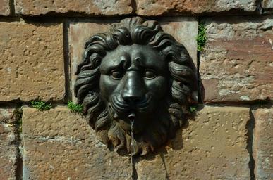 Keywords: fountain wall lion head iron water old town antique masonry stones stone wall