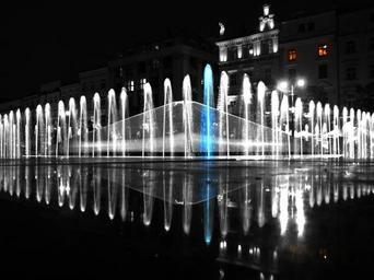 Keywords: fountain water city night poznan tourists stream of water