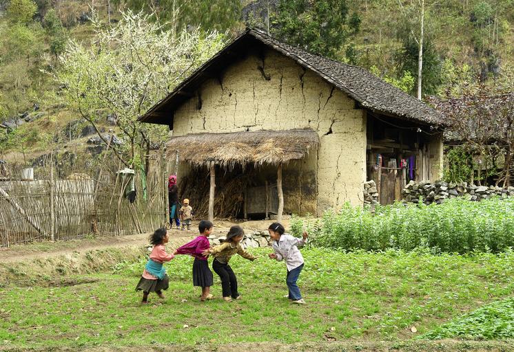 Keywords: four children playing white plum flowers spring house made of clay and straw