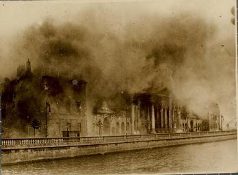 | Keywords: four courts fourcourts na ceithre cĂșirteanna naceithrecĂșirteanna irish civil war irishcivilwar anti-treaty antitreaty national army nationalarmy explosion river liffey riverliffey fire june 1922 1920s inns quay innsquay dublin ireland battle of dublin battleofdublin public records office publicrecordsoffice w.d. hogan wdhogan hogan collection hogancollection national library of ireland nationallibraryofireland monochrome outdoor The Four Courts in Dublin during the Battle of Dublin. The building had been taken over by Anti-Treaty forces on 14 April 1922. Bombarded by National Army forces on 28 and 29 June, a huge explosion of stored munitions on 30 June destroyed the Public Records Office, and with it a huge swathe of Irish cultural memory. Date: 30 June 1922 NLI Ref.: HOG57 The Four Courts in Dublin during the Battle of Dublin. The building had been taken over by Anti-Treaty forces on 14 April 1922. Bombarded by National Army forces on 28 and 29 June, a huge explosion of stored munitions on 30 June destroyed the Public Records Office, and with it a huge swathe of Irish cultural memory. Date: 30 June 1922 NLI Ref.: HOG57 The Four Courts in Dublin during the Battle of Dublin. The building had been taken over by Anti-Treaty forces on 14 April 1922. Bombarded by National Army forces on 28 and 29 June, a huge explosion of stored munitions on 30 June destroyed the Public Records Office, and with it a huge swathe of Irish cultural memory.